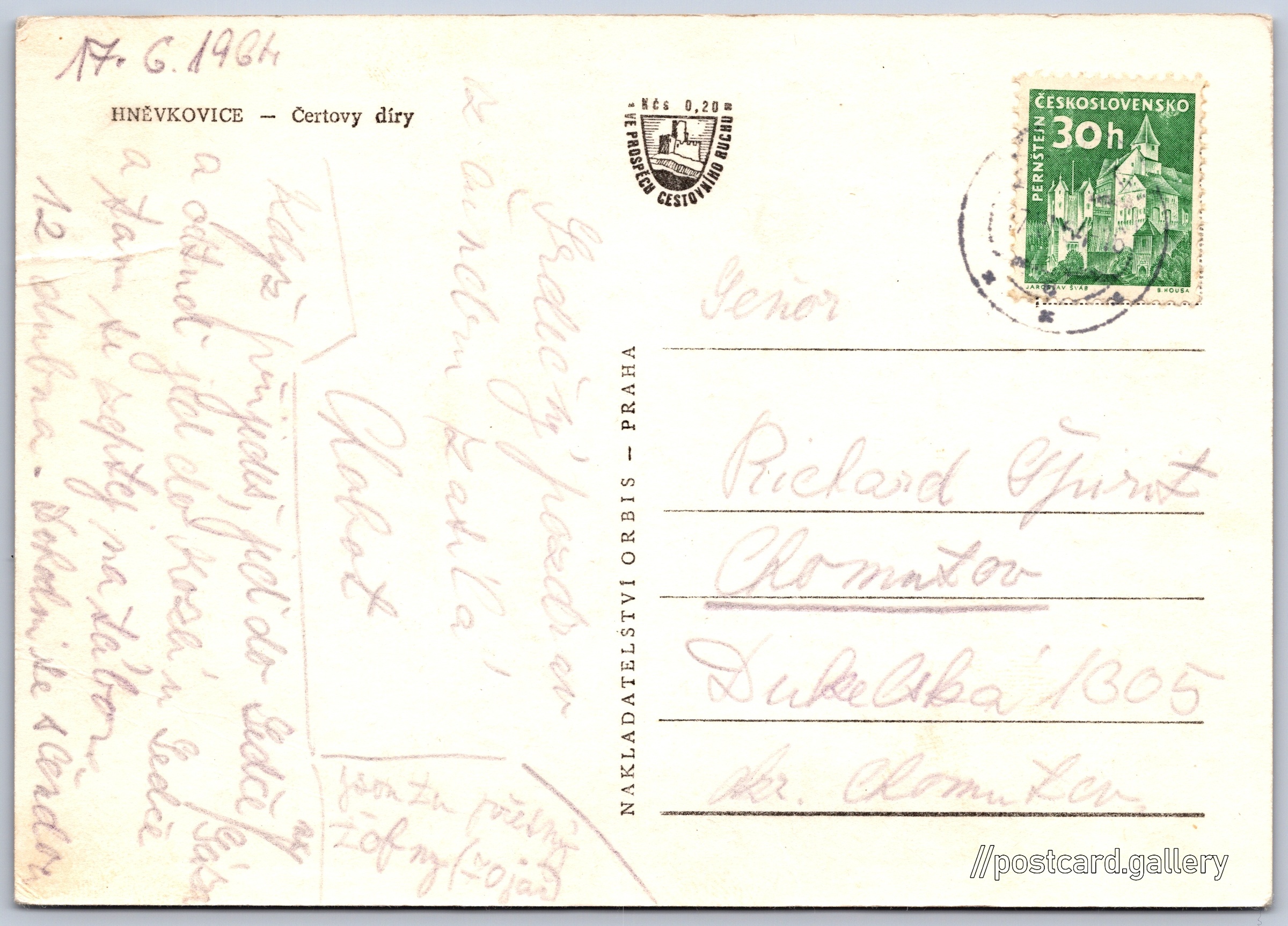 Hněvkovice, Devil's holes Pokud chcete vidět pohlednice ve vyšším rozlišení nebo zobrazovat jejich zadní stranu, tak se prosím nejdříve přihlašte Log in Register HNĚVKOVICE - Čertovy díry Language of printed text on postcard: Czech Čertovy díry, Jeskyně, Hněvkovice, Česko show on map 1 other postcard can be found in the immediate vicinity of the place shown on the postcard Show near postcards Publisher: Nakladatelství Orbis (Czechoslovakia) Estimated issue date of postcard: 1961 - 1964 Help us specify date of postcard publishing Postcard size (w x h) and shape: 146 x 103 mm (5.75" x 4.06"), rectangle Used postcard:Stamp date: 17.6.1964Write date: 17.6.1964 Prices: Fee to support turism: 0,20 Kčs (CSK)Paid stamps: 0,30 Kčs (CSK) DiscussionAdd post Add new folder ... Manage folders ...