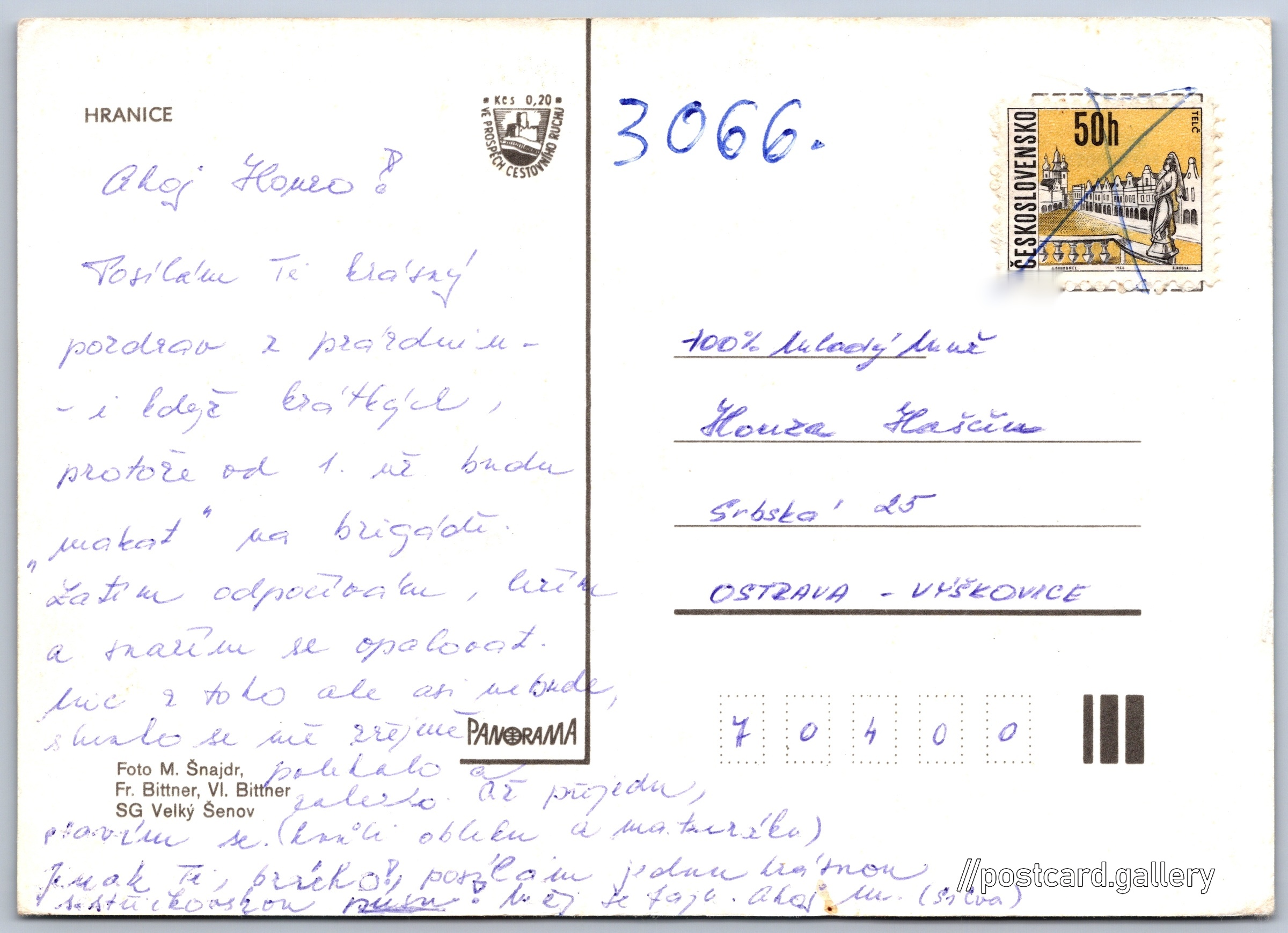 Hranice Pokud chcete vidět pohlednice ve vyšším rozlišení nebo zobrazovat jejich zadní stranu, tak se prosím nejdříve přihlašte Log in Register Hranice HRANICE Language of printed text on postcard: Czech Mostní, Hranice, Přerov show on map 14 other postcards can be found in the immediate vicinity of the place shown on the postcard Show near postcards Publisher: Panorama (Czechoslovakia) Issue date of postcard is not known Help us estimate date of postcard publishing Postcard size (w x h) and shape: 148 x 107 mm (5.83" x 4.21"), rectangle Persons connected with this postcard: Vl. Bittner(Photo author) M. Šnajdr(Photo author) Fr. Bittner(Photo author) Used postcard Prices: Fee to support turism: 0,20 Kčs (CSK)Paid stamps: 0,50 Kčs (CSK) DiscussionAdd post Add new folder ... Manage folders ...