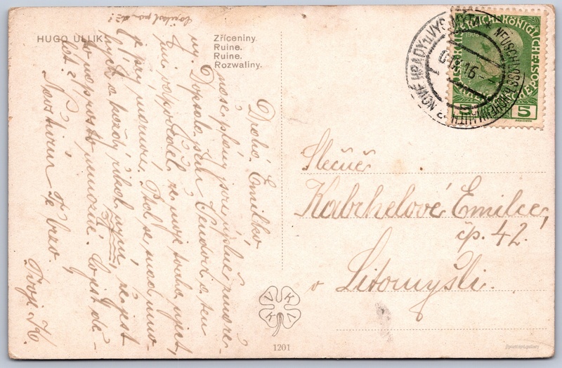 Hugo Ullik, Žebrák and Točník Pokud chcete vidět pohlednice ve vyšším rozlišení nebo zobrazovat jejich zadní stranu, tak se prosím nejdříve přihlašte Log in Register HUGO ULLIK- Zříceniny.- Ruine.- Ruine.- Rozwaliny . Language of printed text on postcard: Czech, English, German, Polish Točník 54, 267 51 Točník, Czechia show on map 2 other postcards can be found in the immediate vicinity of the place shown on the postcard Show near postcards Publisher: VKVK (Czechoslovakia) Estimated issue date of postcard: 1913 - 1916 Help us specify date of postcard publishing Postcard size (w x h) and shape: 140 x 90 mm (5.51" x 3.54"), rectangle Persons connected with this postcard: Hugo Ullik(Artwork author) Used postcard:Stamp date: 10.9.1916 Prices: Paid stamps: 0,05 kr (AHK) Postcard codes: 1201 DiscussionAdd post Add new folder ... Manage folders ...