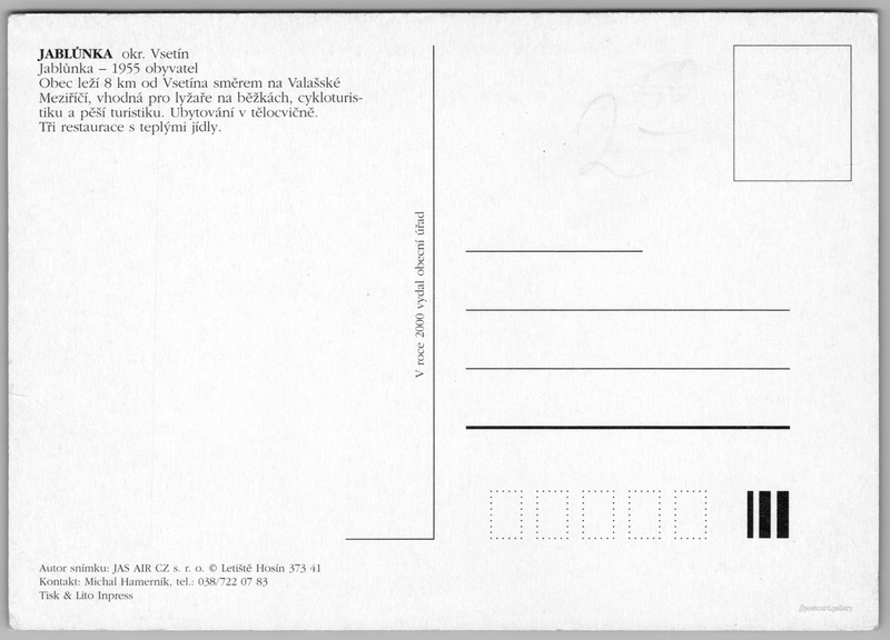 Jablůnka Pokud chcete vidět pohlednice ve vyšším rozlišení nebo zobrazovat jejich zadní stranu, tak se prosím nejdříve přihlašte Log in Register Jablůnka JABLUNKA okr. VsetínJablůnka - 1955 obyvatelObec leží 8 km od Vsetína směrem na Valašské Meziříčí, vhodná pro lyžaře na běžkách, cykloturistiku a pěší turistiku. Ubytování v tělocvičně. Tři restaurace s teplými jídly. Language of printed text on postcard: Czech Jablůnka, Obec, Česko show on map 1 other postcard can be found in the immediate vicinity of the place shown on the postcard Show near postcards Publisher: Obecní úřad Jablůnka (Czechia) Issue year of postcard: 2000 Postcard size (w x h) and shape: 148 x 105 mm (5.83" x 4.13"), rectangle Unused postcard DiscussionAdd post Add new folder ... Manage folders ...