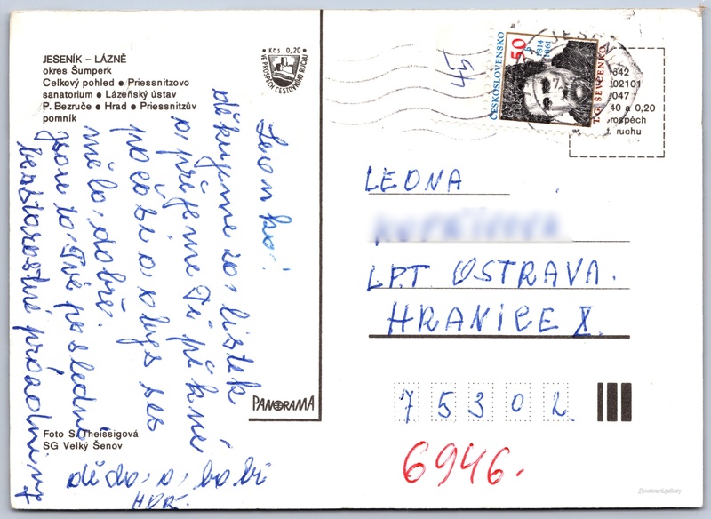Jesenik, spa Pokud chcete vidět pohlednice ve vyšším rozlišení nebo zobrazovat jejich zadní stranu, tak se prosím nejdříve přihlašte Log in Register Jeseník - lázně JESENÍK – LÁZNĚokres Šumperk- Celkový pohled- Priessnitzovo sanatorium- Lázeňský ústav P. Bezruče- Hrad- Priessnitzův pomník Language of printed text on postcard: Czech Lázně Jeseník, Lázeňské místo, Jeseník, Česko show on map Publisher: Panorama (Czechoslovakia) Estimated issue date of postcard: 1986 - 1989 Help us specify date of postcard publishing Postcard size (w x h) and shape: 147 x 105 mm (5.79" x 4.13"), rectangle Persons connected with this postcard: Petr Bezruč(Content of postcard) Vincenc Priessnitz(Content of postcard) S. Theissigová(Photo author) Used postcard:Stamp date: 7.7.1989 Prices: Fee to support turism: 0,20 Kčs (CSK)Paid stamps: 0,50 Kčs (CSK) DiscussionAdd post Add new folder ... Manage folders ...
