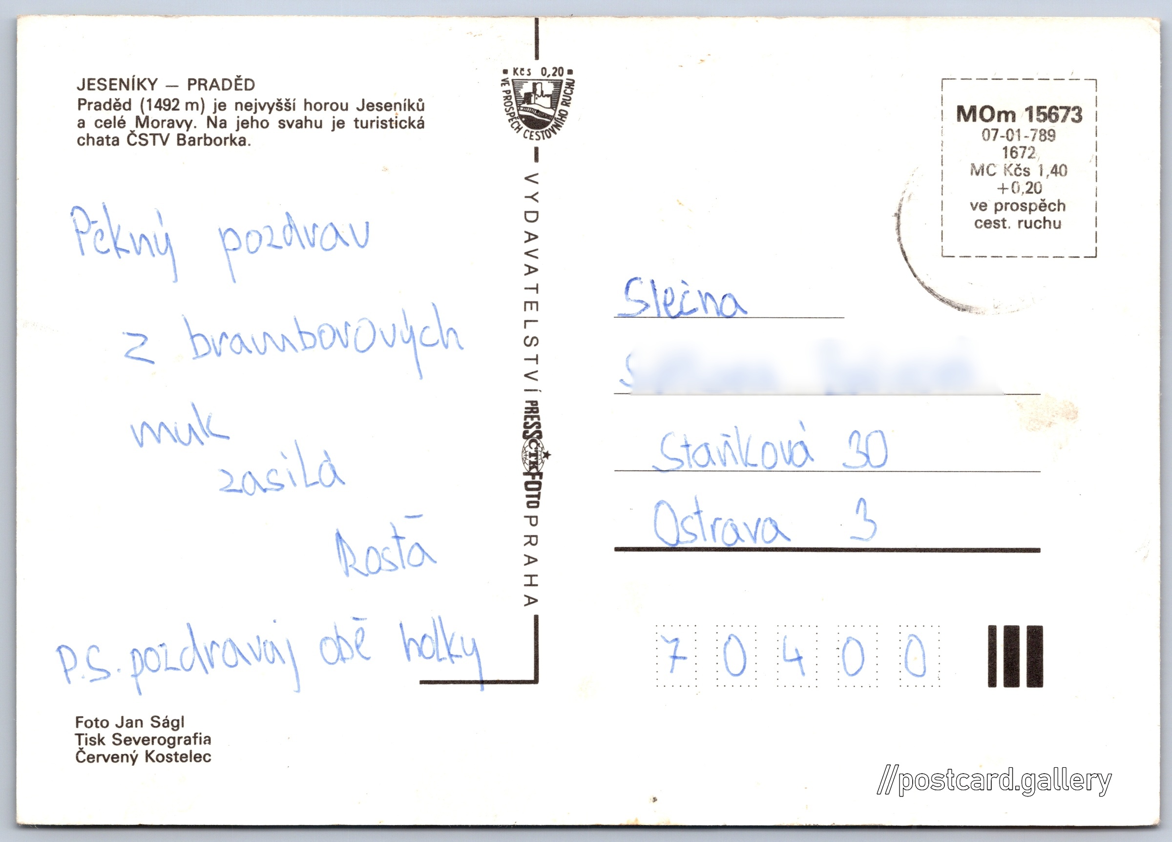 Jeseníky, Praděd Pokud chcete vidět pohlednice ve vyšším rozlišení nebo zobrazovat jejich zadní stranu, tak se prosím nejdříve přihlašte Log in Register Praděd JESENÍKY - PRADĚDPraděd (1492 m) je nejvyšší horou Jeseníků a celé Moravy. Na jeho svahu je turistická chata ČSTV Barborka. Language of printed text on postcard: Czech Rozhledna Praděd, Rozhledna, Malá Morávka ev. č. 38, Malá Morávka, Česko show on map Publisher: PressFoto Praha (Czechoslovakia) Issue year of postcard: 1987 Postcard size (w x h) and shape: 148 x 105 mm (5.83" x 4.13"), rectangle Persons connected with this postcard: Jan Ságl(Photo author) Used postcard Prices: Postcard price: 1,40 Kčs (CSK) (+0,20 Kčs fee to support tourism) Postcard codes: MOm 15673 07-01-789 1672 DiscussionAdd post Add new folder ... Manage folders ...