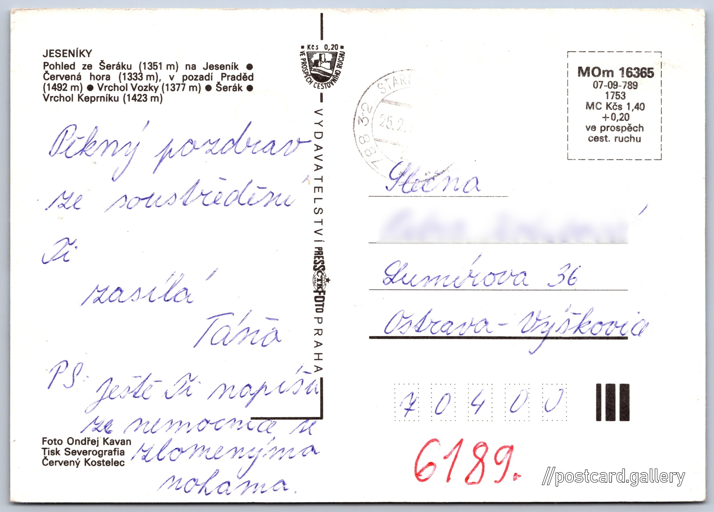 Jeseníky Pokud chcete vidět pohlednice ve vyšším rozlišení nebo zobrazovat jejich zadní stranu, tak se prosím nejdříve přihlašte Log in Register Jeseníky JESENÍKY- Pohled ze Šeráku (1351 m) na Jeseník- Červená hora (1333 m), v pozadí Praděd (1492 m)- Vrchol Vozky (1377 m)- Šerák- Vrchol Keprníku (1423 m) Language of printed text on postcard: Czech Keprník (1423 m), Hora, výškový bod, Ostružná, Česko show on map Publisher: PressFoto Praha (Czechoslovakia) Issue year of postcard: 1987 Postcard size (w x h) and shape: 148 x 105 mm (5.83" x 4.13"), rectangle Persons connected with this postcard: Ondřej Kavan(Photo author) Used postcard Prices: Postcard price: 1,40 Kčs (CSK) (+0,20 Kčs fee to support tourism) Postcard codes: MOm 16365 07-09-789 1753 DiscussionAdd post Add new folder ... Manage folders ...