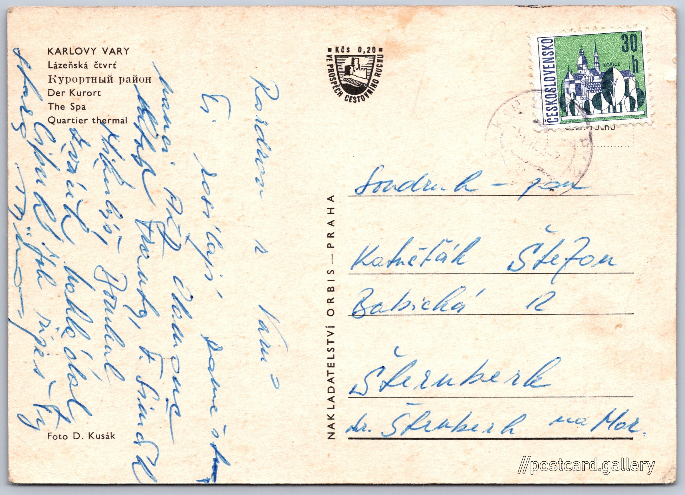 Karlovy Vary, spa district Pokud chcete vidět pohlednice ve vyšším rozlišení nebo zobrazovat jejich zadní stranu, tak se prosím nejdříve přihlašte Log in Register KARLOVY VARY- Lázeňská čtvrť- Курортный район- Der Kurort- The Spa- Quartier thermal Language of printed text on postcard: Czech, Russian, German, English, French, French Nová louka, Karlovy Vary, Karlovy Vary show on map 62 other postcards can be found in the immediate vicinity of the place shown on the postcard Show near postcards Publisher: Nakladatelství Orbis (Czechoslovakia) Issue date of postcard is not known Help us estimate date of postcard publishing Postcard size (w x h) and shape: 147 x 106 mm (5.79" x 4.17"), rectangle Persons connected with this postcard: Dalibor Kusák(Photo author) Used postcard Prices: Fee to support turism: 0,20 Kčs (CSK)Paid stamps: 0,30 Kčs (CSK) DiscussionAdd post Add new folder ... Manage folders ...