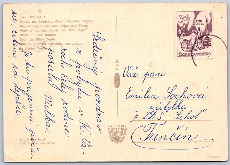 Karlovy Vary, view of the spa quarter Pokud chcete vidět pohlednice ve vyšším rozlišení nebo zobrazovat jejich zadní stranu, tak se prosím nejdříve přihlašte Log in Register KARLOVY VARY- Pohled na lázeňskou čtvrť přes řeku Teplou- Вид на курортный район через реку Тепла- View of the spa across the river Teplá- Blick auf das Heilbad über den Fluss Teplá- Vue du quartier balnéaire par-dessus la rivière Tepla Language of printed text on postcard: Czech Divadelní náměstí, Karlovy Vary, Karlovy Vary show on map 62 other postcards can be found in the immediate vicinity of the place shown on the postcard Show near postcards Publisher: PressFoto Praha (Czechoslovakia) Estimated issue date of postcard: 1963 - 1967 Help us specify date of postcard publishing Postcard size (w x h) and shape: 149 x 105 mm (5.87" x 4.13"), rectangle Persons connected with this postcard: Hynek Šantl(Photo author) Used postcard Prices: Fee to support turism: 0,20 Kčs (CSK)Paid stamps: 0,30 Kčs (CSK) DiscussionAdd post Add new folder ... Manage folders ...