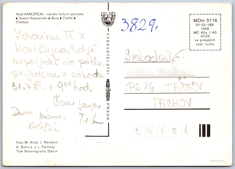 Karlstejn Castle Pokud chcete vidět pohlednice ve vyšším rozlišení nebo zobrazovat jejich zadní stranu, tak se prosím nejdříve přihlašte Log in Register Karlštejn Hrad KARLŠTEJN - národní kulturní památkaЗамок Карлштейн - Burg - Castle - Château Language of printed text on postcard: Czech, Russian, German, English, French, French Hrad Karlštejn, Hrad, Karlštejn 172, Karlštejn, Česko show on map Publisher: PressFoto Praha (Czechoslovakia) Issue year of postcard: 1981 Postcard size (w x h) and shape: 148 x 105 mm (5.83" x 4.13"), rectangle Persons connected with this postcard: Miroslav Krob(Photo author) Jan Tachezy(Photo author) Jan Neubert(Photo author) Karel Šefrna(Photo author) Used postcard Prices: Postcard price: 1,40 Kčs (CSK) (+0,20 Kčs fee to support tourism) Postcard codes: MOm 5116 01-02-189 1345 DiscussionAdd post Add new folder ... Manage folders ...
