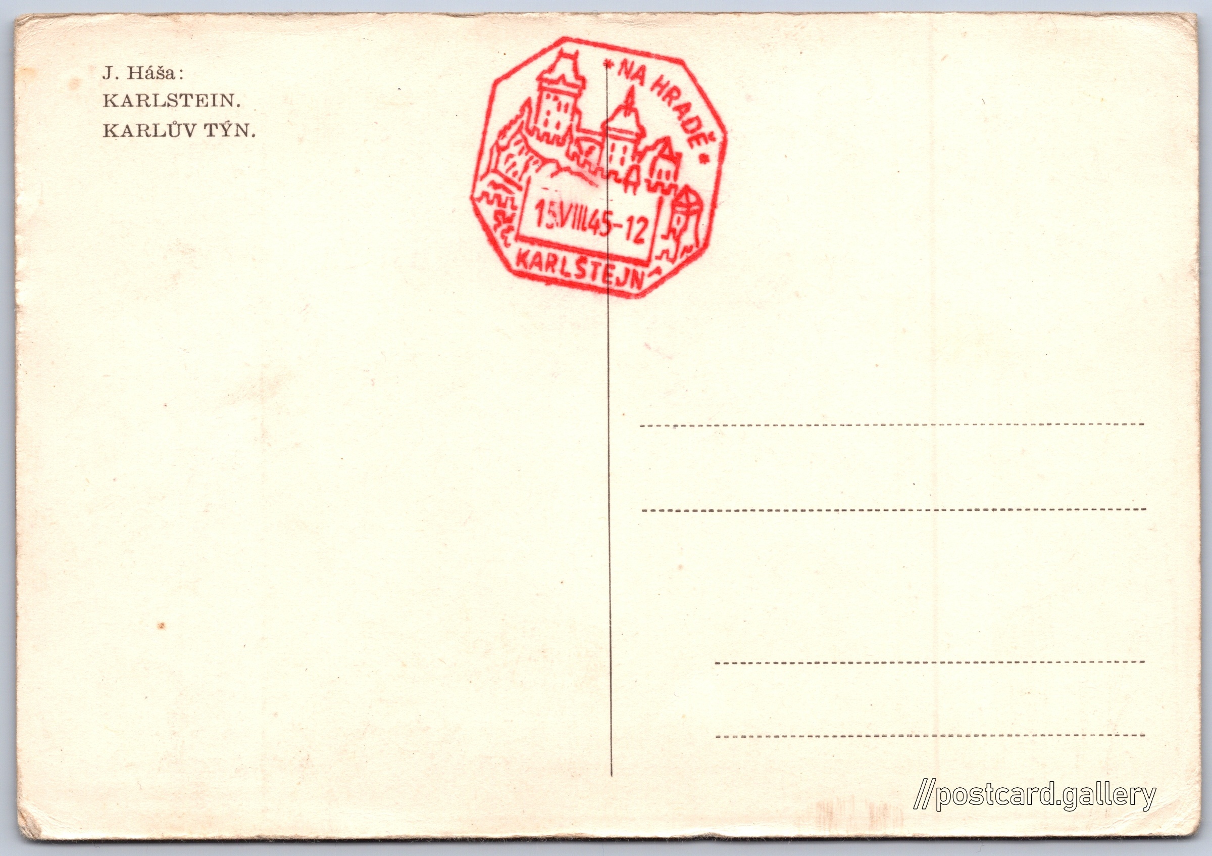 Karlstejn, Jaroslav Háša, painting Pokud chcete vidět pohlednice ve vyšším rozlišení nebo zobrazovat jejich zadní stranu, tak se prosím nejdříve přihlašte Log in Register J. Háša:KARLSTEIN.KARLŮV TÝN. Language of printed text on postcard: Czech, German Hrad Karlštejn, Hrad, Karlštejn 172, Karlštejn, Česko show on map Estimated issue date of postcard: 1940 - 1945 Help us specify date of postcard publishing Postcard size (w x h) and shape: 149 x 104 mm (5.87" x 4.09"), rectangle Persons connected with this postcard: Jaroslav Háša(Artwork author) Unused postcard DiscussionAdd post Add new folder ... Manage folders ...
