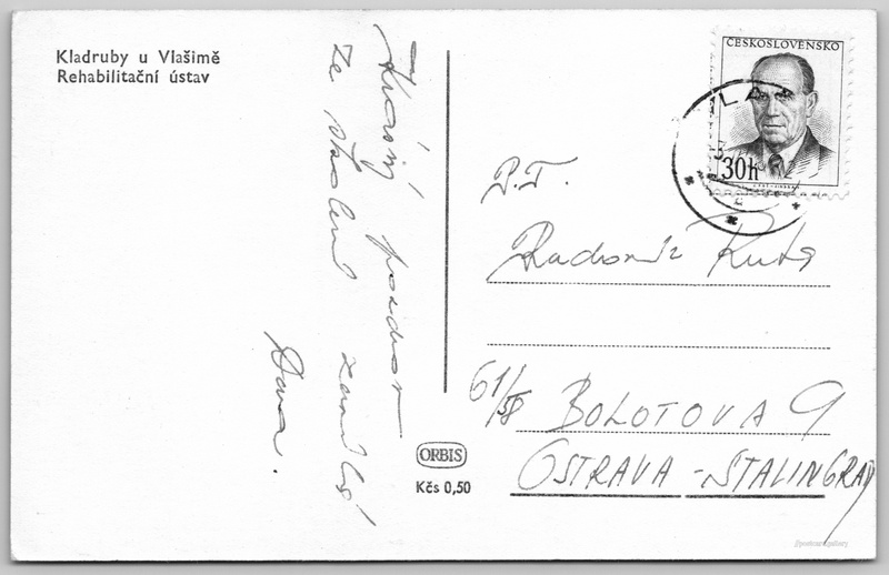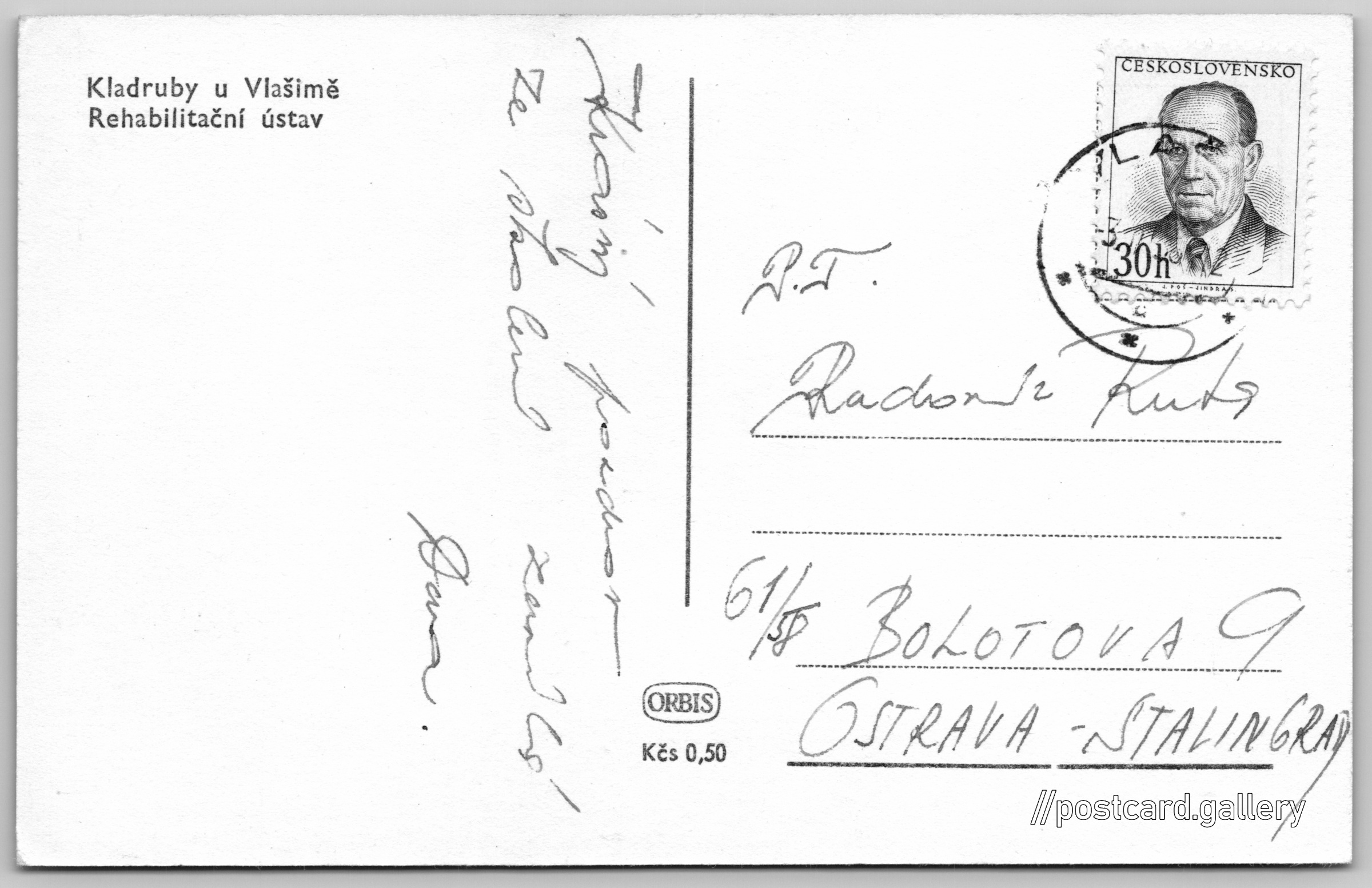 Kladruby u Vlašimi, rehabilitation institute Pokud chcete vidět pohlednice ve vyšším rozlišení nebo zobrazovat jejich zadní stranu, tak se prosím nejdříve přihlašte Log in Register Kladruby u VlašiměRehabilitační ústav Language of printed text on postcard: Czech Rehabilitační ústav Kladruby, Kladruby 30, Kladruby, Středočeský kraj, Česko show on map 3 other postcards can be found in the immediate vicinity of the place shown on the postcard Show near postcards Publisher: Nakladatelství Orbis (Czechoslovakia) Issue date of postcard is not known Help us estimate date of postcard publishing Postcard size (w x h) and shape: 136 x 87 mm (5.35" x 3.43"), rectangle Used postcard Prices: Paid stamps: 0,30 Kčs (CSK) DiscussionAdd post Add new folder ... Manage folders ...