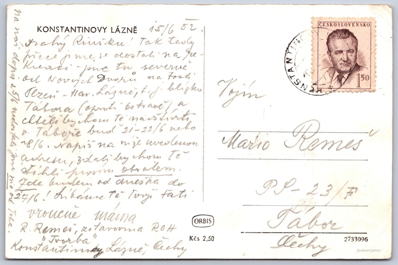 Konstantinovy Lázně Pokud chcete vidět pohlednice ve vyšším rozlišení nebo zobrazovat jejich zadní stranu, tak se prosím nejdříve přihlašte Log in Register KONSTANTINOVY LÁZNĚ Language of printed text on postcard: Czech Konstantinovy Lázně, Obec, Česko show on map Publisher: Nakladatelství Orbis (Czechoslovakia) Estimated issue date of postcard: 1949 - 1952 Help us specify date of postcard publishing Postcard size (w x h) and shape: 138 x 91 mm (5.43" x 3.58"), rectangle Used postcard:Stamp date: 16.6.1952Write date: 15.6.1952 Prices: Postcard price: 2,50 Kčs (CSK)Paid stamps: 1,50 Kčs (CSK) Postcard codes: 2733096 DiscussionAdd post Add new folder ... Manage folders ...