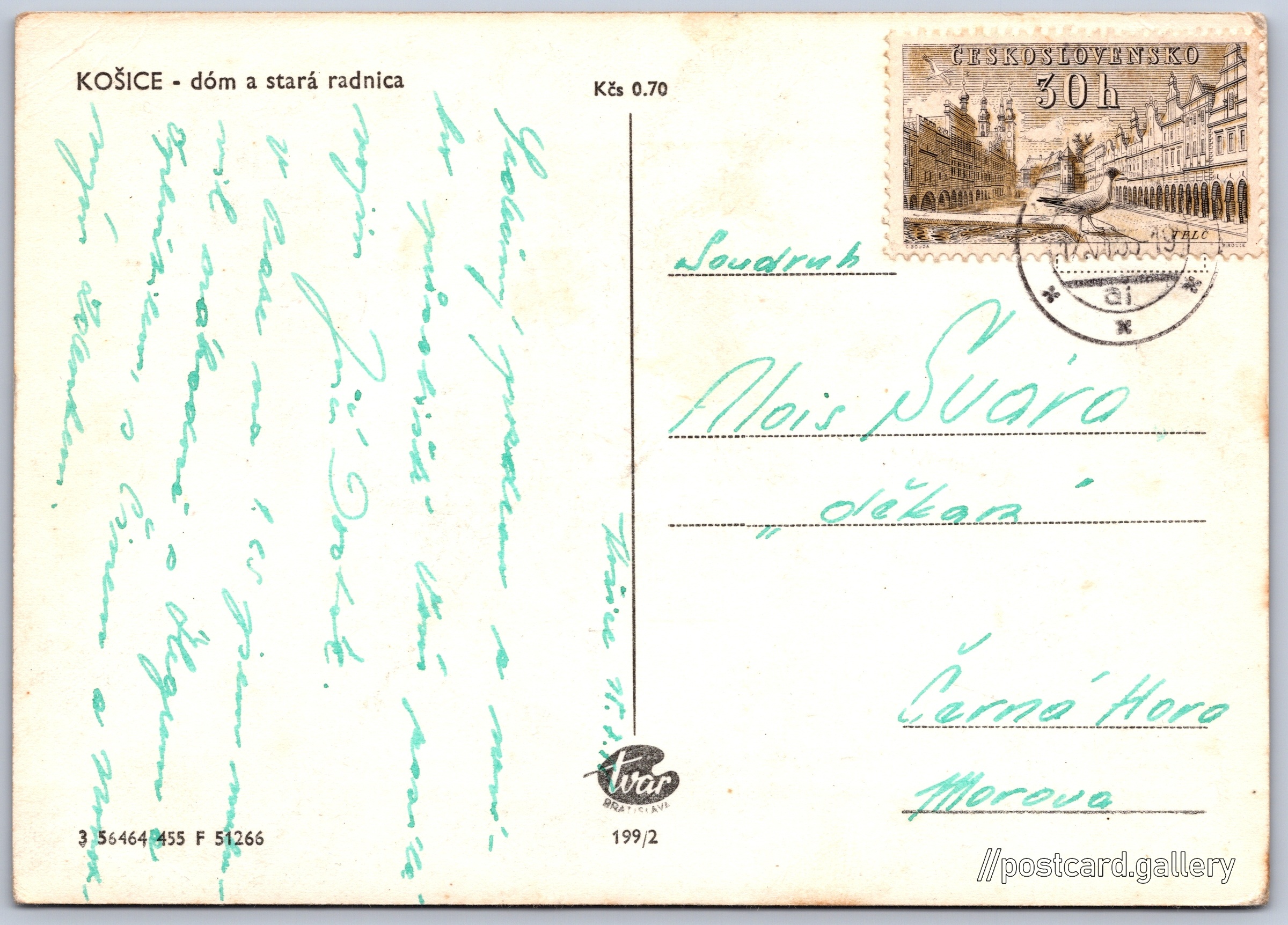 Košice, old town hall Pokud chcete vidět pohlednice ve vyšším rozlišení nebo zobrazovat jejich zadní stranu, tak se prosím nejdříve přihlašte Log in Register KOŠICE - dóm a stará radnica Language of printed text on postcard: Slovak Katedrála svaté Alžběty, Kostel, Hlavné námestie 1/4, Košice - Staré Mesto, Slovensko show on map 12 other postcards can be found in the immediate vicinity of the place shown on the postcard Show near postcards Publisher: Tvar Bratislava (Czechoslovakia) Issue year of postcard: April, 1955 Postcard size (w x h) and shape: 148 x 104 mm (5.83" x 4.09"), rectangle Used postcard:Stamp date: 17.7.1955Write date: 15.7.1955 Prices: Postcard price: 0,70 Kčs (CSK)Paid stamps: 0,30 Kčs (CSK) Postcard codes: 3 56464 455 F 51266 199/2 DiscussionAdd post Add new folder ... Manage folders ...