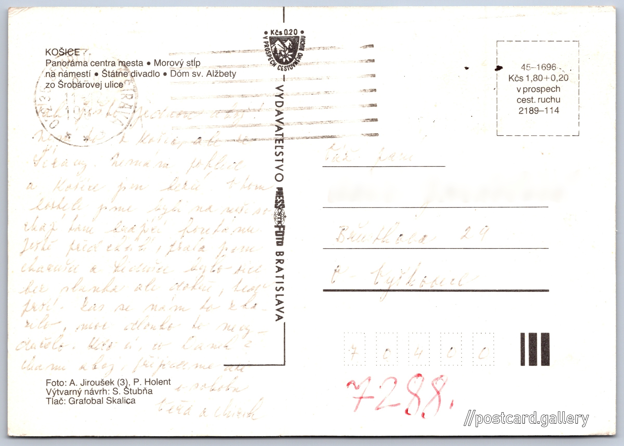 Košice Pokud chcete vidět pohlednice ve vyšším rozlišení nebo zobrazovat jejich zadní stranu, tak se prosím nejdříve přihlašte Log in Register Košice KOŠICE- Panoráma centra mesta- Morový stĺp na namesti- Statne divadlo- Dom sv. Alžbety zo Šrobárovej ulice Language of printed text on postcard: Slovak Námestie osloboditeľov show on map Publisher: PressFoto Bratislava (Czechoslovakia) Issue year of postcard: 1989 Postcard size (w x h) and shape: 148 x 105 mm (5.83" x 4.13"), rectangle Persons connected with this postcard: S. Štubňa(Postcard designer) Peter Holent(Photo author) Alexander Jiroušek(Photo author) Used postcard Prices: Postcard price: 1,30 Kčs (CSK) (+0,20 Kčs fee to support tourism) Postcard codes: 45-1696 2189-114 DiscussionAdd post Add new folder ... Manage folders ...