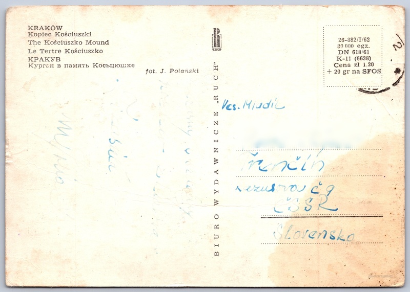 Krakow, Kosciuszko Mound Pokud chcete vidět pohlednice ve vyšším rozlišení nebo zobrazovat jejich zadní stranu, tak se prosím nejdříve přihlašte Log in Register KRAKÓW- Kopiec Kościuszki- The Kościuszko Mound- Le Tertre KościuszkoКРАКУВ- Курган в память Косьцюшке Language of printed text on postcard: Polish, English, French, Russian Kościuszkova mohyla, Pomník, památník, Krakov - Zwierzyniec, Polsko show on map Publisher: Ruch (Poland) Issue year of postcard: 1962 Postcard size (w x h) and shape: 148 x 104 mm (5.83" x 4.09"), rectangle Persons connected with this postcard: J. Polański(Photo author) Used postcard Prices: Postcard price: 1,20 zł (PLN) (+0,20 zł fee to support tourism) Postcard codes: 26-882/I/62 DN 618/61 K-11 (6638) DiscussionAdd post Add new folder ... Manage folders ...