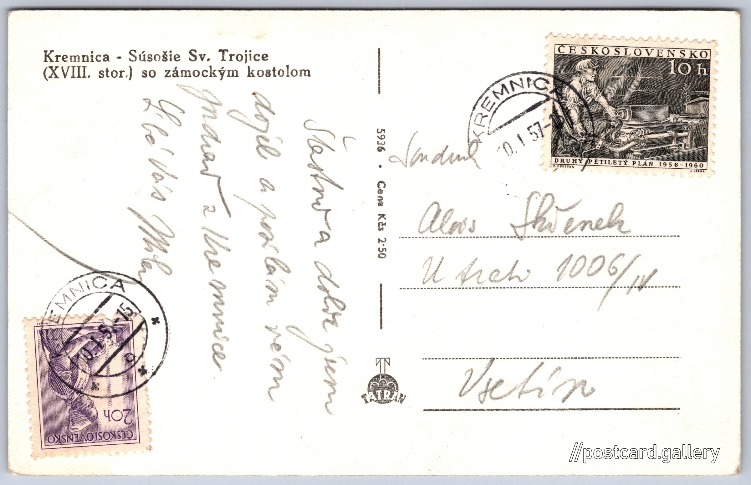 Kremnica, sculpture of the Holy Trinity Pokud chcete vidět pohlednice ve vyšším rozlišení nebo zobrazovat jejich zadní stranu, tak se prosím nejdříve přihlašte Log in Register Kremnica - Súsošie Sv. Trojice(XVIII. stor.) so zámockým kostolom Language of printed text on postcard: Slovak Plague column, Pomník, památník, Kremnica, Slovensko show on map 3 other postcards can be found in the immediate vicinity of the place shown on the postcard Show near postcards Publisher: Tatran (Czechoslovakia) Estimated issue date of postcard: 1948 - 1952 Help us specify date of postcard publishing Postcard size (w x h) and shape: 140 x 89 mm (5.51" x 3.50"), rectangle Used postcard:Stamp date: 10.1.1957 Prices: Postcard price: 2,50 Kčs (CSK)Paid stamps: 0,30 Kčs (CSK) Postcard codes: 5936 DiscussionAdd post Add new folder ... Manage folders ...