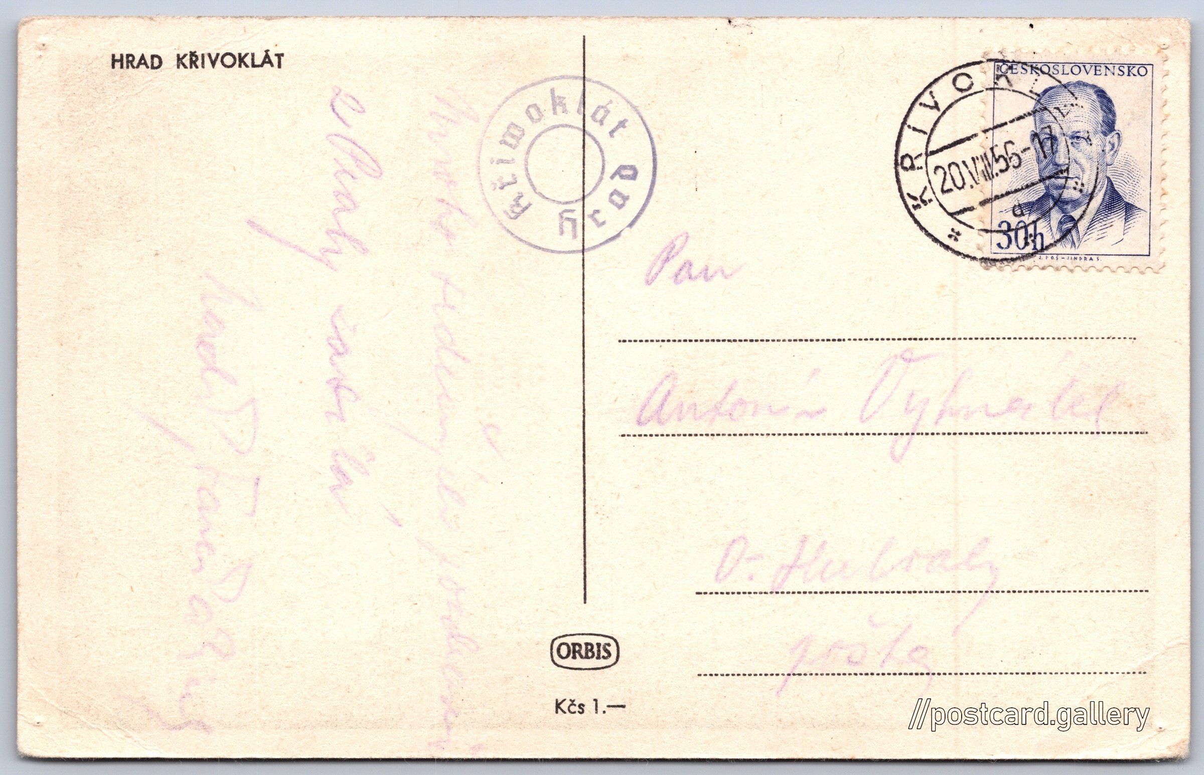 Křivoklát Castle Pokud chcete vidět pohlednice ve vyšším rozlišení nebo zobrazovat jejich zadní stranu, tak se prosím nejdříve přihlašte Log in Register HRAD KŘIVOKLÁT Language of printed text on postcard: Czech Hrad Křivoklát, Hrad, Křivoklát 132, Křivoklát, Česko show on map Publisher: Nakladatelství Orbis (Czechoslovakia) Estimated issue date of postcard: 1953 - 1956 Help us specify date of postcard publishing Postcard size (w x h) and shape: 139 x 88 mm (5.47" x 3.46"), rectangle Used postcard:Stamp date: 20.8.1956 Prices: Postcard price: 1,00 Kčs (CSK)Paid stamps: 0,30 Kčs (CSK) DiscussionAdd post Add new folder ... Manage folders ...