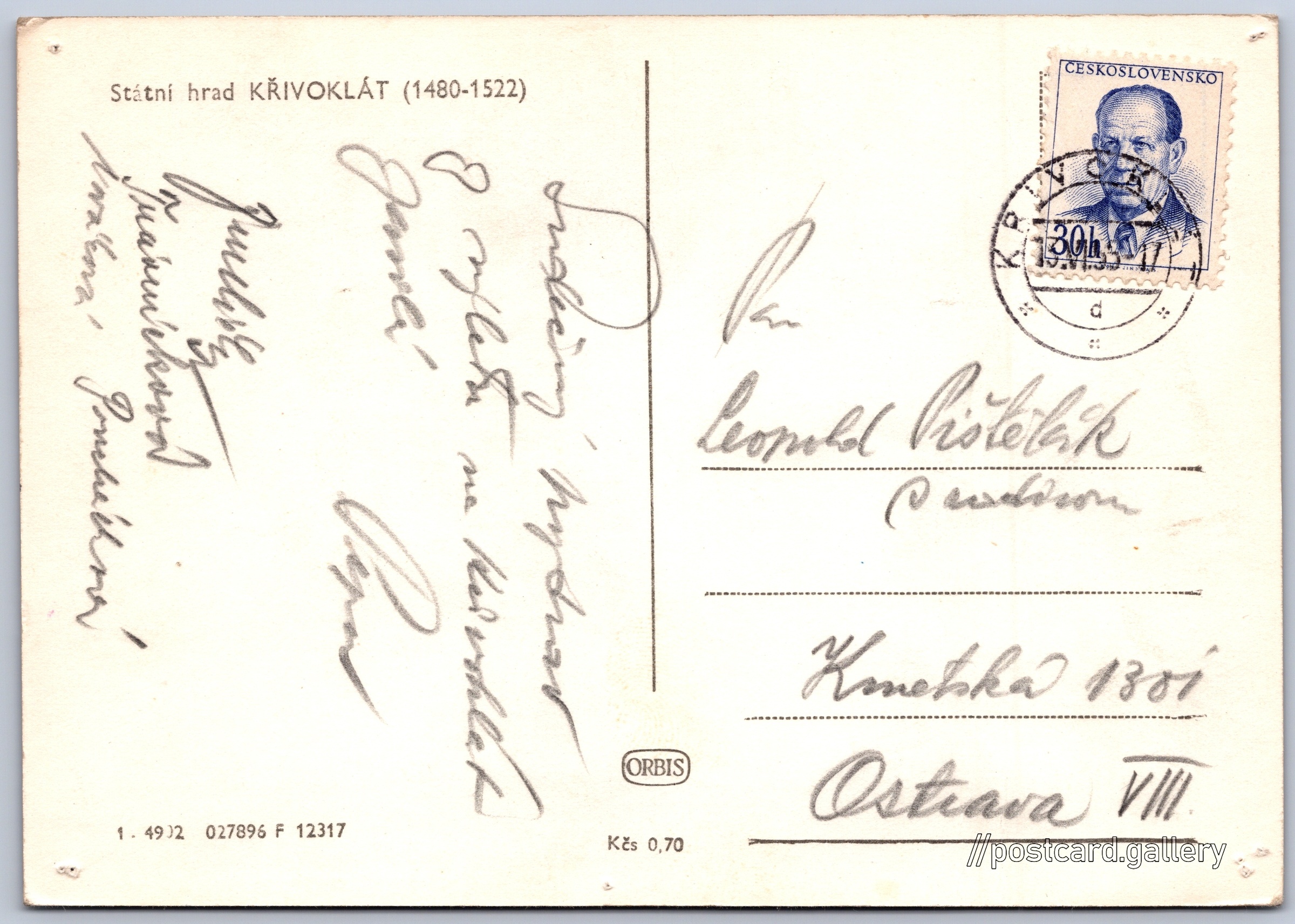 Křivoklát State Castle Pokud chcete vidět pohlednice ve vyšším rozlišení nebo zobrazovat jejich zadní stranu, tak se prosím nejdříve přihlašte Log in Register Státní hrad KŘIVOKLÁT (1480-1522) Language of printed text on postcard: Czech Hrad Křivoklát, Hrad, Křivoklát 132, Křivoklát, Česko show on map Publisher: Nakladatelství Orbis (Czechoslovakia) Estimated issue date of postcard: 1952 - 1955 Help us specify date of postcard publishing Postcard size (w x h) and shape: 147 x 103 mm (5.79" x 4.06"), rectangle Used postcard:Stamp date: 13.6.1955 Prices: Postcard price: 0,70 Kčs (CSK)Paid stamps: 0,30 Kčs (CSK) Postcard codes: 1-4902 027896 F 12317 DiscussionAdd post Add new folder ... Manage folders ...