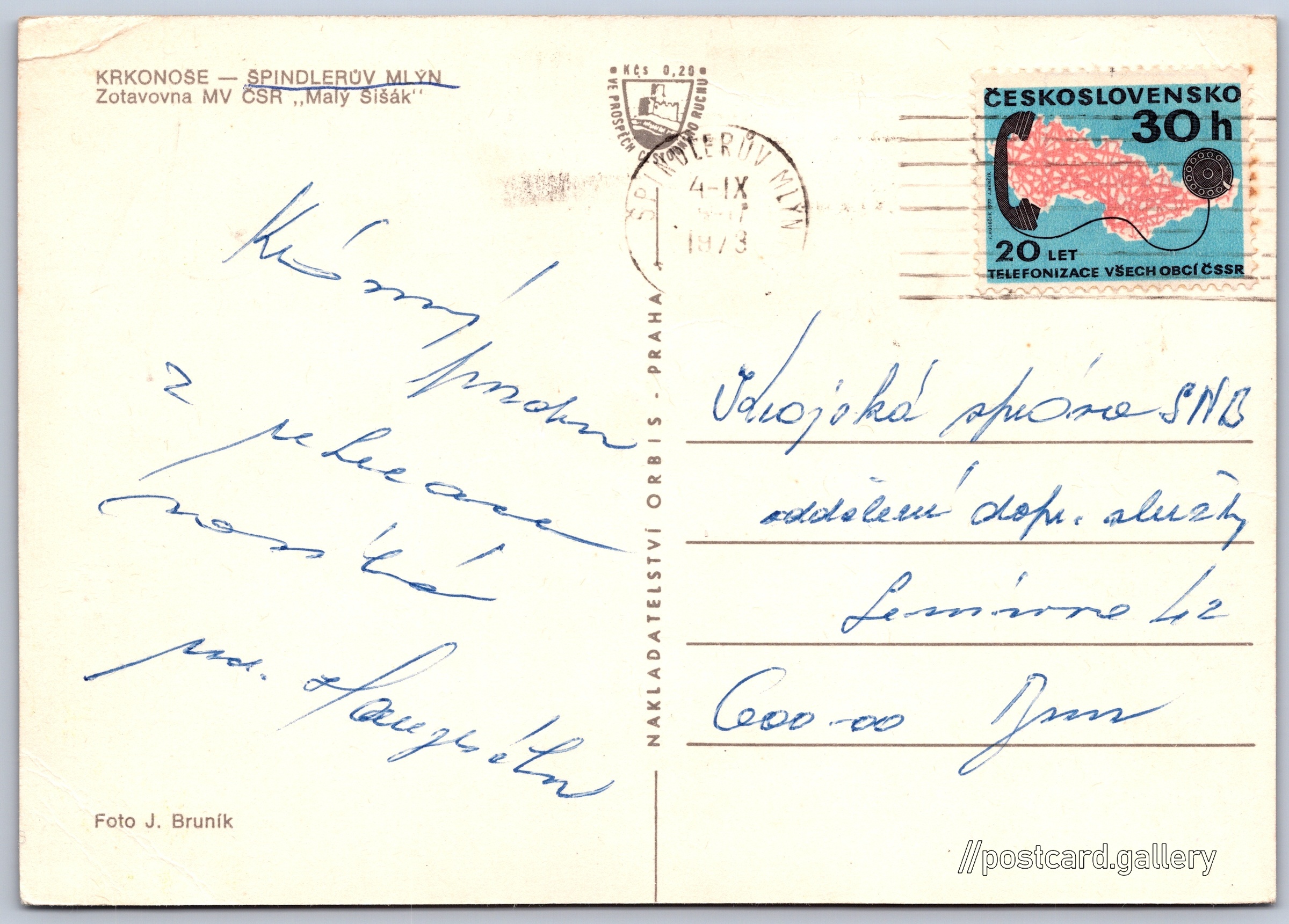Krkonoše Mountains, Malý Šišák rest home Pokud chcete vidět pohlednice ve vyšším rozlišení nebo zobrazovat jejich zadní stranu, tak se prosím nejdříve přihlašte Log in Register KRKONOŠE - ŠPINDLERŮV MLÝNZotavovna MV ČSR "Malý Šišák" Language of printed text on postcard: Czech Volareza - penzion Malý Šišák**, Špindlerův Mlýn, Špindlerův Mlýn, Česko show on map 30 other postcards can be found in the immediate vicinity of the place shown on the postcard Show near postcards Publisher: Nakladatelství Orbis (Czechoslovakia) Estimated issue date of postcard: 1970 - 1973 Help us specify date of postcard publishing Postcard size (w x h) and shape: 149 x 105 mm (5.87" x 4.13"), rectangle Persons connected with this postcard: Jiří Bruník(Photo author) Used postcard:Stamp date: 4.9.1973 Prices: Fee to support turism: 0,20 Kčs (CSK)Paid stamps: 0,30 Kčs (CSK) DiscussionAdd post Add new folder ... Manage folders ...