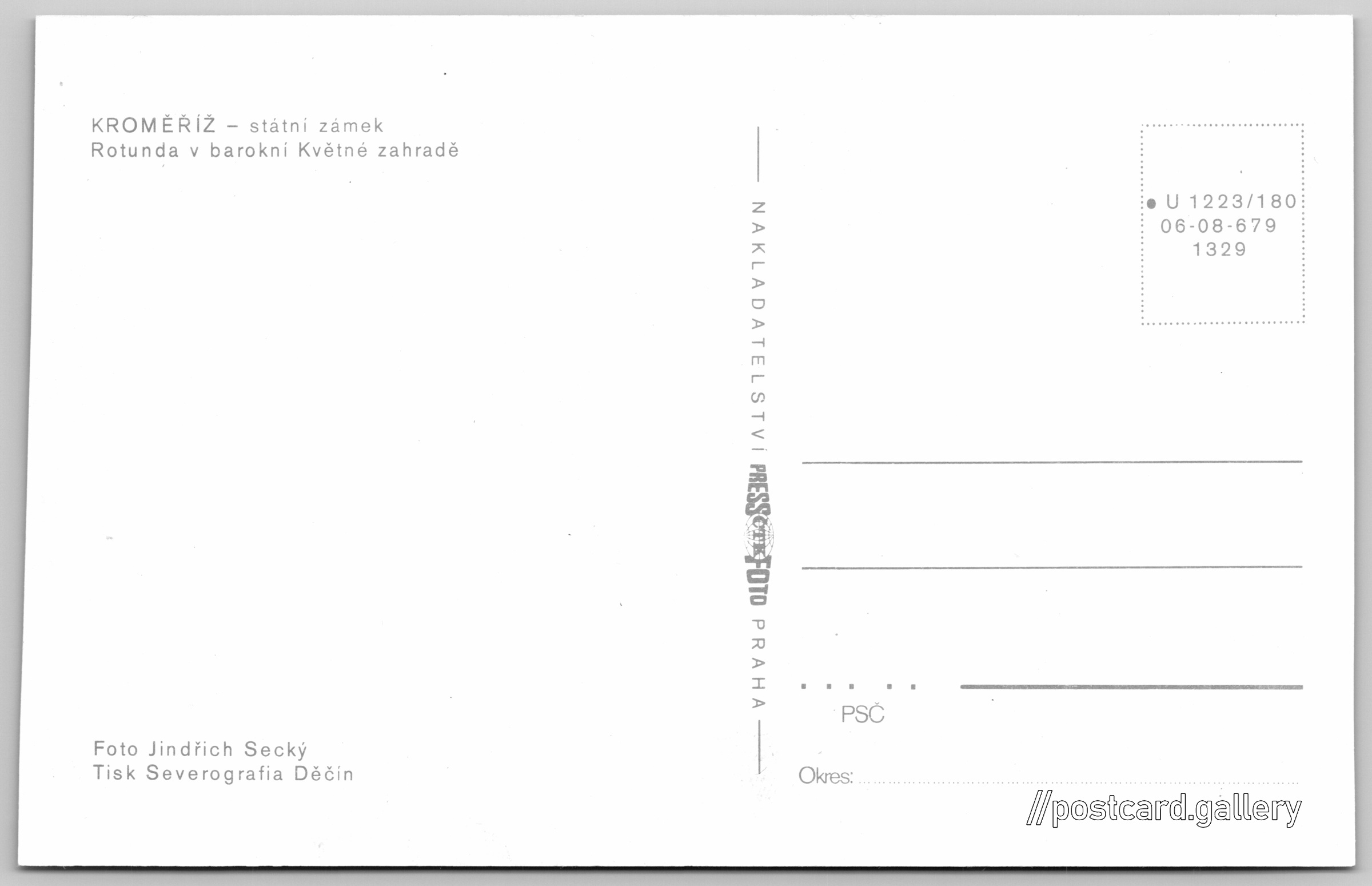 Kroměříž, rotunda in the Garden of Flowers 1/20 Pokud chcete vidět pohlednice ve vyšším rozlišení nebo zobrazovat jejich zadní stranu, tak se prosím nejdříve přihlašte Log in Register KROMĚŘÍŽ - státní zámekRotunda v barokní Květné zahradě Language of printed text on postcard: Czech Kroměříž, Kroměříž show on map 20 other postcards can be found in the immediate vicinity of the place shown on the postcard Show near postcards Publisher: PressFoto Praha (Czechoslovakia) Issue year of postcard: 1976 Postcard size (w x h) and shape: 140 x 89 mm (5.51" x 3.50"), rectangle Persons connected with this postcard: Jindřich Secký(Photo author) Unused postcard Postcard codes: •U 1223/180 06-08-679 1329 DiscussionAdd post Add new folder ... Manage folders ...