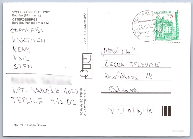 Krušné Hory Pokud chcete vidět pohlednice ve vyšším rozlišení nebo zobrazovat jejich zadní stranu, tak se prosím nejdříve přihlašte Log in Register Krušné Hory VÝCHODNÍ KRUŠNÉ HORYBouřňák (871 m n.m.)OSTERZGEBIRGEBerg Bouřňák (871 m ü.d.M.) Language of printed text on postcard: Czech, German Bouřňák (869 m), Hora, výškový bod, Moldava, Česko show on map 1 other postcard can be found in the immediate vicinity of the place shown on the postcard Show near postcards Publisher: Vydavatelství NIS, v.o.s. (Czechia) Estimated issue date of postcard: 1997 - 2000 Help us specify date of postcard publishing Postcard size (w x h) and shape: 147 x 105 mm (5.79" x 4.13"), rectangle Persons connected with this postcard: PhDr. Dušan Špička(Photo author) Used postcard:Stamp date: 24.2.2000 Prices: Paid stamps: 5,00 Kč (CZK) DiscussionAdd post Add new folder ... Manage folders ...