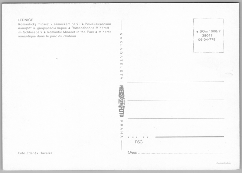Lednice, minaret Pokud chcete vidět pohlednice ve vyšším rozlišení nebo zobrazovat jejich zadní stranu, tak se prosím nejdříve přihlašte Log in Register LEDNICE- Romantický minaret v zámeckém parku- Pомантический минарет в дворцовом парке- Romantisches Minarett im Schlosspark- Romantic Minaret in the Park- Minaret romantique dans le parc du château Language of printed text on postcard: Czech Publisher: PressFoto Praha (Czechoslovakia) Issue year of postcard: 1977 Postcard size (w x h) and shape: 147 x 104 mm (5.79" x 4.09"), rectangle Persons connected with this postcard: Zdeněk Havelka(Photo author) Unused postcard Postcard codes: SOm 1008/7 38041 06-04-779 DiscussionAdd post Add new folder ... Manage folders ...