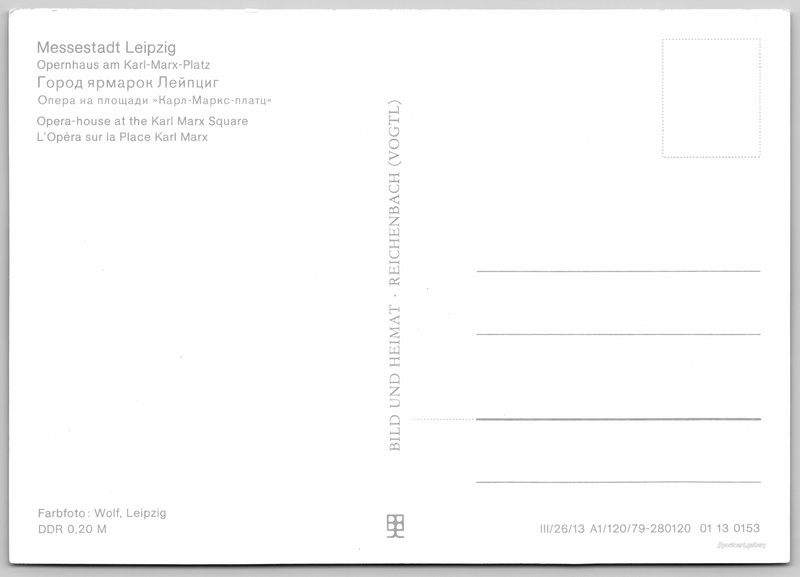 Leipzig, opera on Karl Marx Square Pokud chcete vidět pohlednice ve vyšším rozlišení nebo zobrazovat jejich zadní stranu, tak se prosím nejdříve přihlašte Log in Register Messestadt LeipzigOpernhaus am Karl-Marx-PlatzГород ярмарок ЛейпцигОпера на площади >Карл-Маркс-платц«Opera-house at the Karl Marx SquareL'Opéra sur la Place Karl MarxFarbfoto: Wolf, LeipzigDDR 0,20 M Language of printed text on postcard: German Opera v Lipsku, Augustusplatz 12, Lipsko - Mitte, Německo show on map 5 other postcards can be found in the immediate vicinity of the place shown on the postcard Show near postcards Publisher: Bild und Heimat (Germany) Issue date of postcard is not known Help us estimate date of postcard publishing Postcard size (w x h) and shape: 148 x 105 mm (5.83" x 4.13"), rectangle Persons connected with this postcard: Karl Marx(Postcard content - text) Unused postcard Prices: Postcard price: 0,20 M (MDN) Postcard codes: III/26/13 A1/120/79-280120 01 13 0153 DiscussionAdd post Add new folder ... Manage folders ...