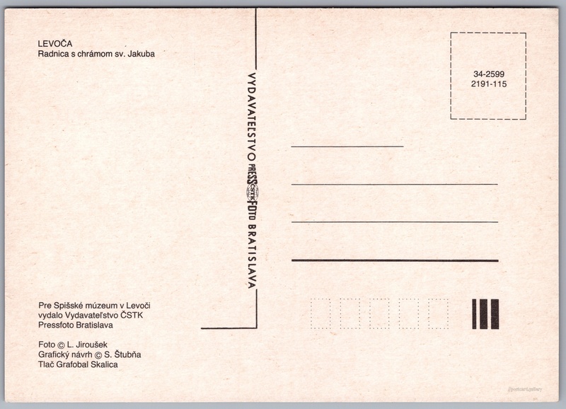 Levoča, square Pokud chcete vidět pohlednice ve vyšším rozlišení nebo zobrazovat jejich zadní stranu, tak se prosím nejdříve přihlašte Log in Register Levoča LEVOČARadnica s chrámom sv. Jakuba Language of printed text on postcard: Slovak Mestský úrad Levoča, Námestie Majstra Pavla 4/4, Levoča, Slovensko show on map 3 other postcards can be found in the immediate vicinity of the place shown on the postcard Show near postcards Publisher: PressFoto Bratislava (Czechoslovakia) Issue year of postcard: 1991 Postcard size (w x h) and shape: 148 x 105 mm (5.83" x 4.13"), rectangle Persons connected with this postcard: S. Štubňa(Postcard designer) Ladislav Jiroušek(Photo author) Unused postcard Postcard codes: 34-2599 2191-115 DiscussionAdd post Add new folder ... Manage folders ...