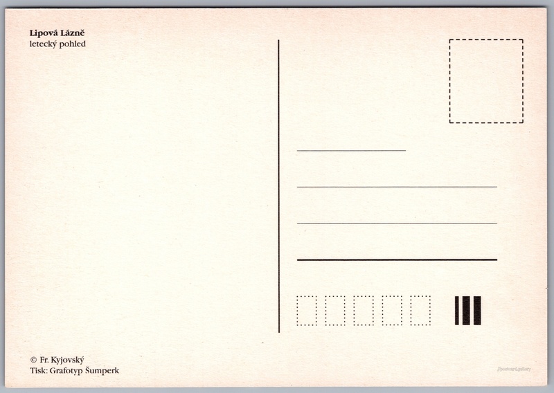 Lipová Lázně Pokud chcete vidět pohlednice ve vyšším rozlišení nebo zobrazovat jejich zadní stranu, tak se prosím nejdříve přihlašte Log in Register Lipová Lázně Lipová Lázněletecký pohled Language of printed text on postcard: Czech Lipová-lázně, Obec, Česko show on map 18 other postcards can be found in the immediate vicinity of the place shown on the postcard Show near postcards Issue date of postcard is not known Help us estimate date of postcard publishing Postcard size (w x h) and shape: 150 x 104 mm (5.91" x 4.09"), rectangle Persons connected with this postcard: František Kyjovský(Photo author) Unused postcard DiscussionAdd post Add new folder ... Manage folders ...