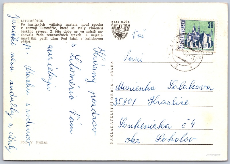 Litomerice, house Pod bání Pokud chcete vidět pohlednice ve vyšším rozlišení nebo zobrazovat jejich zadní stranu, tak se prosím nejdříve přihlašte Log in Register LITOMĚŘICEPo husitských válkách nastala nová epocha v rozvoji Litoměřic, které se staly Florencií českého severu. Z této doby se ve městě zachovala řada renesančních staveb. K nejzajímavějším patří dům Pod bání s kalichovou věžicí. Language of printed text on postcard: Czech Dům Kalich, Historická budova, Mírové náměstí 15/7, Litoměřice-Město, Česko show on map 7 other postcards can be found in the immediate vicinity of the place shown on the postcard Show near postcards Publisher: Nakladatelství Orbis (Czechoslovakia) Estimated issue date of postcard: 1970 - 1973 Help us specify date of postcard publishing Postcard size (w x h) and shape: 148 x 103 mm (5.83" x 4.06"), rectangle Persons connected with this postcard: Vladimír Fyman(Photo author) Used postcard:Stamp date: 26.4.1973 Prices: Fee to support turism: 0,20 Kčs (CSK)Paid stamps: 0,30 Kčs (CSK) DiscussionAdd post Add new folder ... Manage folders ...