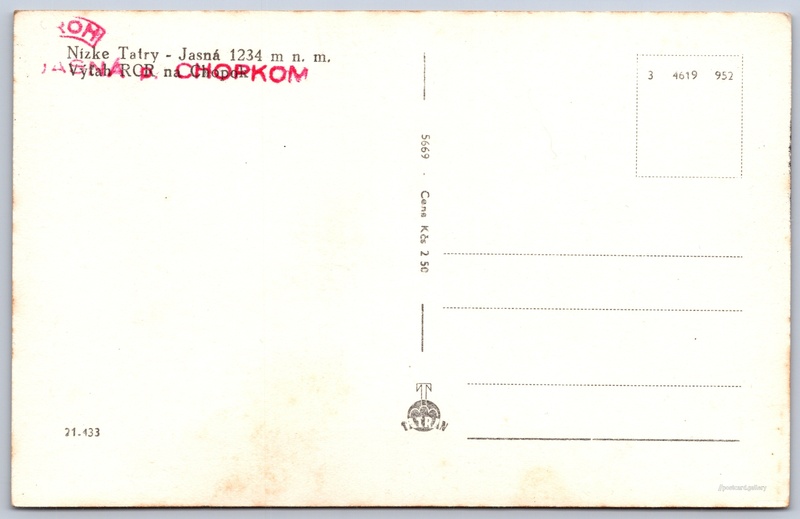 Low Tatras, cableway to Chopok Pokud chcete vidět pohlednice ve vyšším rozlišení nebo zobrazovat jejich zadní stranu, tak se prosím nejdříve přihlašte Log in Register Nízke Tatry - Jasná 1234 m n. m.Výtah ROR na Chopok Language of printed text on postcard: Slovak Demänovská Dolina show on map 31 other postcards can be found in the immediate vicinity of the place shown on the postcard Show near postcards Publisher: Tatran (Czechoslovakia) Issue year of postcard: September, 1952 Postcard size (w x h) and shape: 139 x 89 mm (5.47" x 3.50"), rectangle Unused postcard Prices: Postcard price: 2,50 Kčs (CSK) Postcard codes: 21-433 5669 3 4619 952 DiscussionAdd post Add new folder ... Manage folders ...