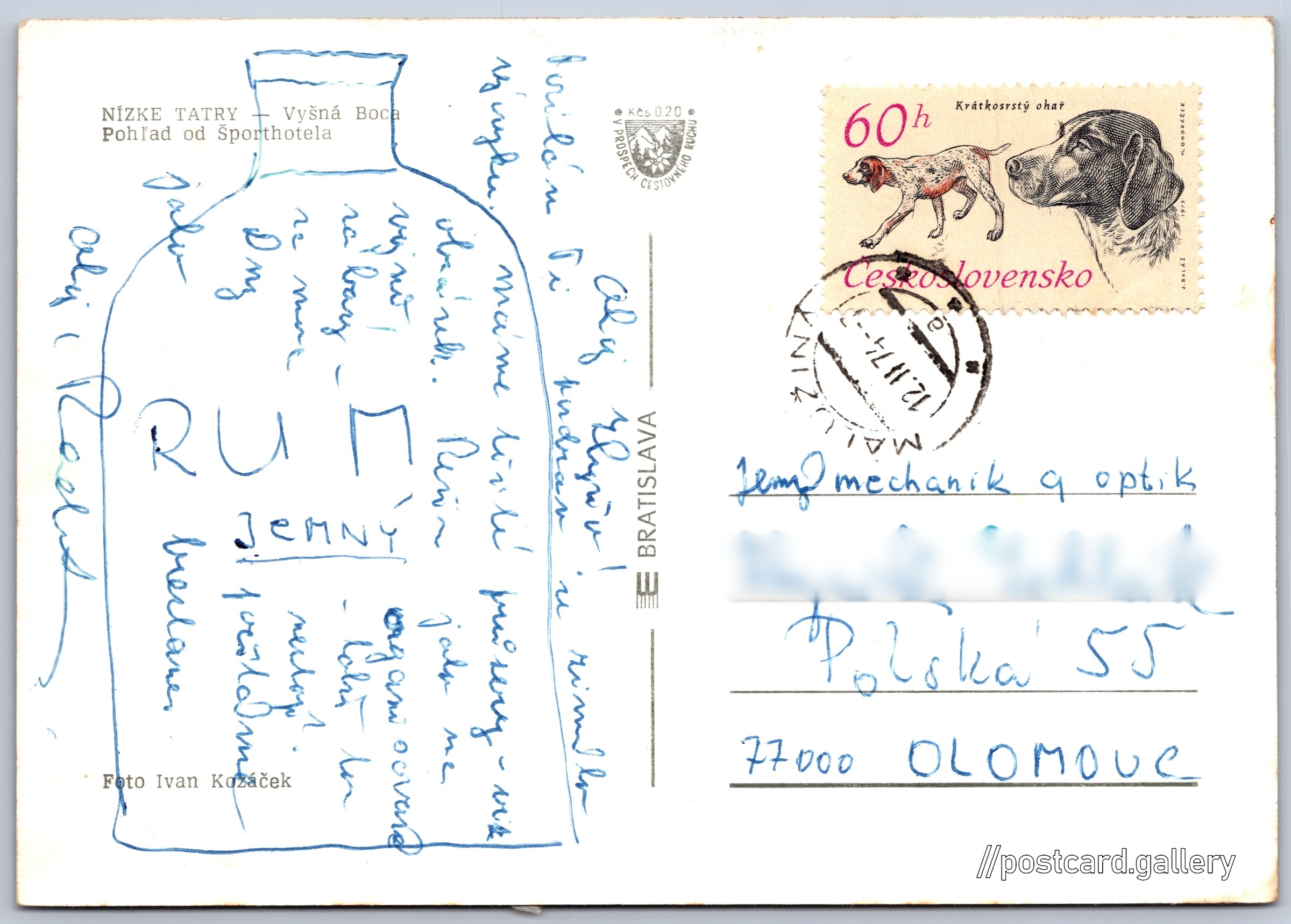 Low Tatras, Vyšná Boca Pokud chcete vidět pohlednice ve vyšším rozlišení nebo zobrazovat jejich zadní stranu, tak se prosím nejdříve přihlašte Log in Register NÍZKE TATRY - Vyšná BocaPohľad od Športhotela Language of printed text on postcard: Slovak Vyšná Boca, Vesnice, Slovensko show on map Publisher: E Bratislava (Czechoslovakia) Estimated issue date of postcard: 1971 - 1974 Help us specify date of postcard publishing Postcard size (w x h) and shape: 146 x 102 mm (5.75" x 4.02"), rectangle Persons connected with this postcard: Ivan Kozáček(Photo author) Used postcard:Stamp date: 12.2.1974 Prices: Fee to support turism: 0,20 Kčs (CSK)Paid stamps: 0,60 Kčs (CSK) DiscussionAdd post Add new folder ... Manage folders ...
