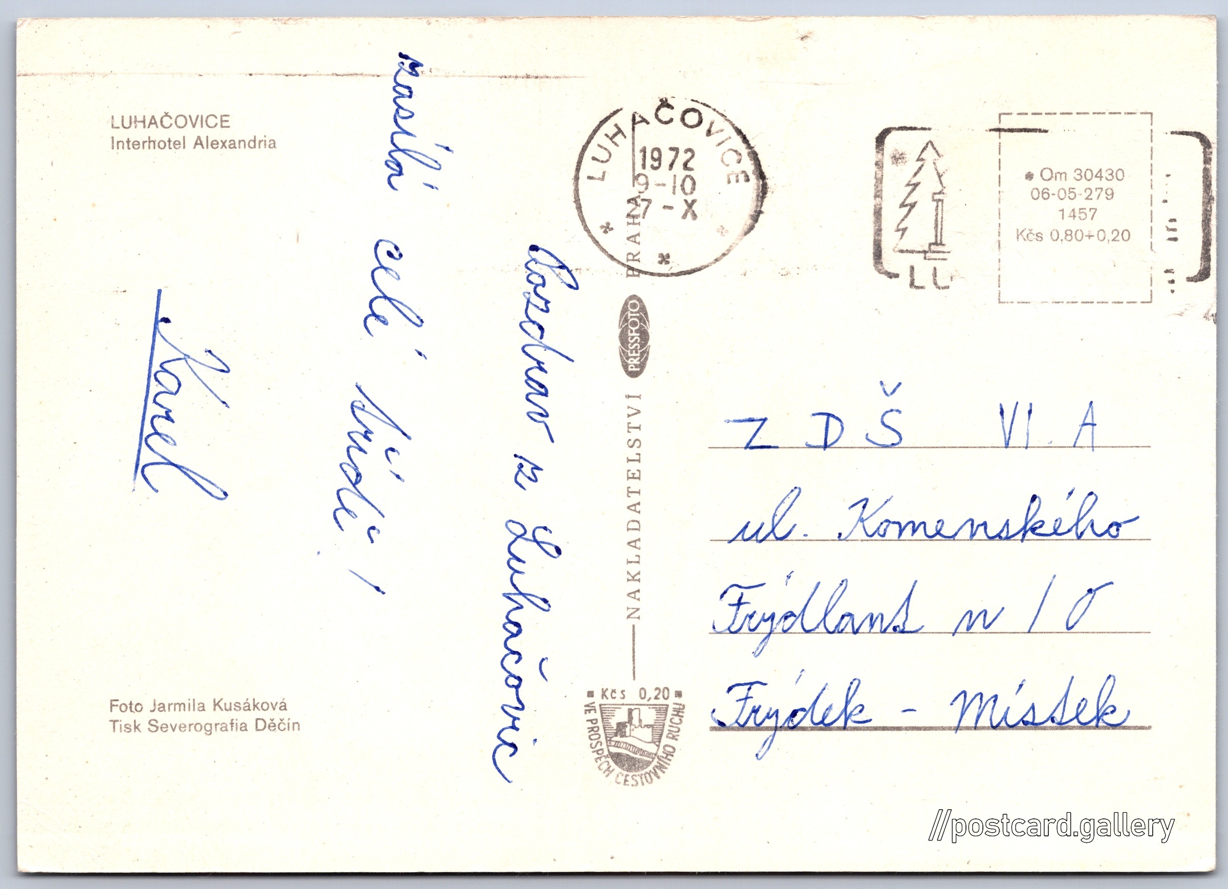 Luhačovice, Interhotel Alexandria Pokud chcete vidět pohlednice ve vyšším rozlišení nebo zobrazovat jejich zadní stranu, tak se prosím nejdříve přihlašte Log in Register LUHAČOVICEInterhotel Alexandria Language of printed text on postcard: Czech ALEXANDRIA**** Spa & Wellness hotel, Masarykova 567, Luhačovice, Česko show on map 29 other postcards can be found in the immediate vicinity of the place shown on the postcard Show near postcards Publisher: PressFoto Praha (Czechoslovakia) Issue year of postcard: 1972 Postcard size (w x h) and shape: 147 x 105 mm (5.79" x 4.13"), rectangle Persons connected with this postcard: Jarmila Kusáková(Photo author) Used postcard:Stamp date: 27.10.1972 Prices: Postcard price: 0,80 Kčs (CSK) (+0,20 Kčs fee to support tourism) Postcard codes: Om 30430 06-05-279 1457 DiscussionAdd post Add new folder ... Manage folders ...