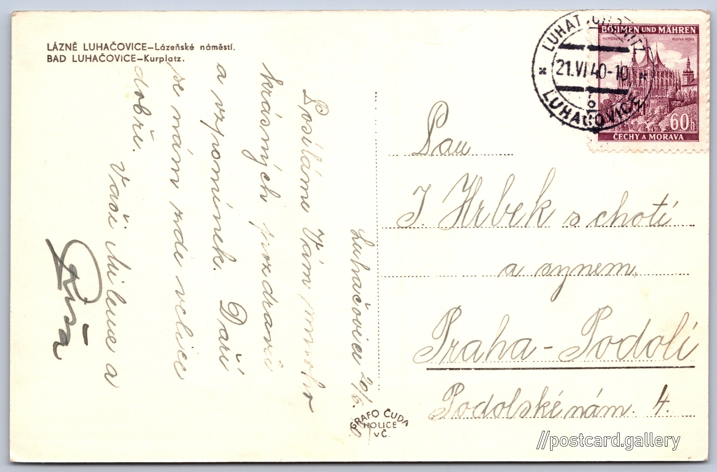 Luhačovice, spa square Pokud chcete vidět pohlednice ve vyšším rozlišení nebo zobrazovat jejich zadní stranu, tak se prosím nejdříve přihlašte Log in Register LÁZNĚ LUHAČOVICE - Lázeňské náměstí,BAD LUHAČOVICE - Kurplatz. Language of printed text on postcard: Czech Luhačovice, Zlín show on map 29 other postcards can be found in the immediate vicinity of the place shown on the postcard Show near postcards Estimated issue date of postcard: 1939 - 1940 Help us specify date of postcard publishing Postcard size (w x h) and shape: 140 x 90 mm (5.51" x 3.54"), rectangle Used postcard:Stamp date: 21.6.1940Write date: 20.6.1940 Prices: Paid stamps: 0,60 Kčs (CSK) DiscussionAdd post Add new folder ... Manage folders ...