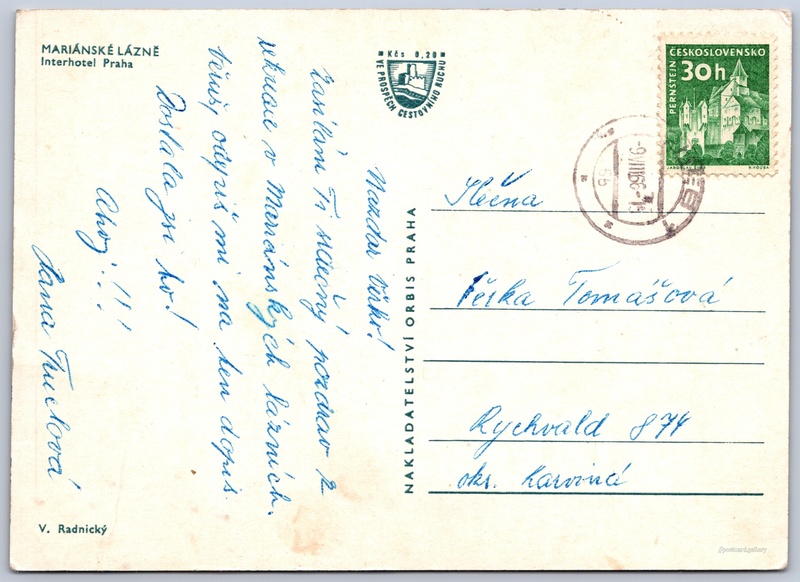 Mariánské Lázně, Interhotal Praha 4/52 Pokud chcete vidět pohlednice ve vyšším rozlišení nebo zobrazovat jejich zadní stranu, tak se prosím nejdříve přihlašte Log in Register MARIÁNSKÉ LÁZNĚInterhotel Praha Language of printed text on postcard: Czech Hlavní třída 67/8, Mariánské Lázně, 353 01, Cheb show on map 52 other postcards can be found in the immediate vicinity of the place shown on the postcard Show near postcards Publisher: Nakladatelství Orbis (Czechoslovakia) Estimated issue date of postcard: 1963 - 1966 Help us specify date of postcard publishing Postcard size (w x h) and shape: 146 x 104 mm (5.75" x 4.09"), rectangle Persons connected with this postcard: Viktor Radnický(Photo author) Used postcard:Stamp date: 9.8.1966 Prices: Fee to support turism: 0,20 Kčs (CSK)Paid stamps: 0,30 Kčs (CSK) DiscussionAdd post Add new folder ... Manage folders ...