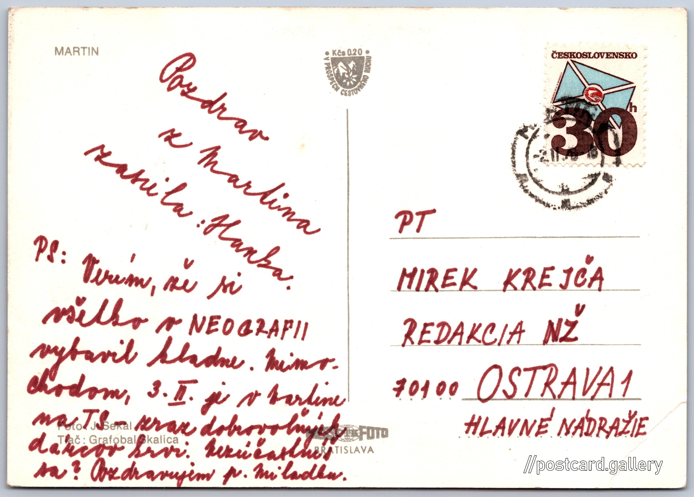 Martin, square Pokud chcete vidět pohlednice ve vyšším rozlišení nebo zobrazovat jejich zadní stranu, tak se prosím nejdříve přihlašte Log in Register MARTIN Language of printed text on postcard: Slovak Martin, Město, Slovensko show on map The exact location is unknown. If you know it, please write it in the comments or mark it on the map Publisher: PressFoto Bratislava (Czechoslovakia) Issue date of postcard is not known Help us estimate date of postcard publishing Postcard size (w x h) and shape: 148 x 104 mm (5.83" x 4.09"), rectangle Persons connected with this postcard: Josef Sekal(Photo author) Used postcard Prices: Fee to support turism: 0,20 Kčs (CSK)Paid stamps: 0,30 Kčs (CSK) DiscussionAdd post Add new folder ... Manage folders ...