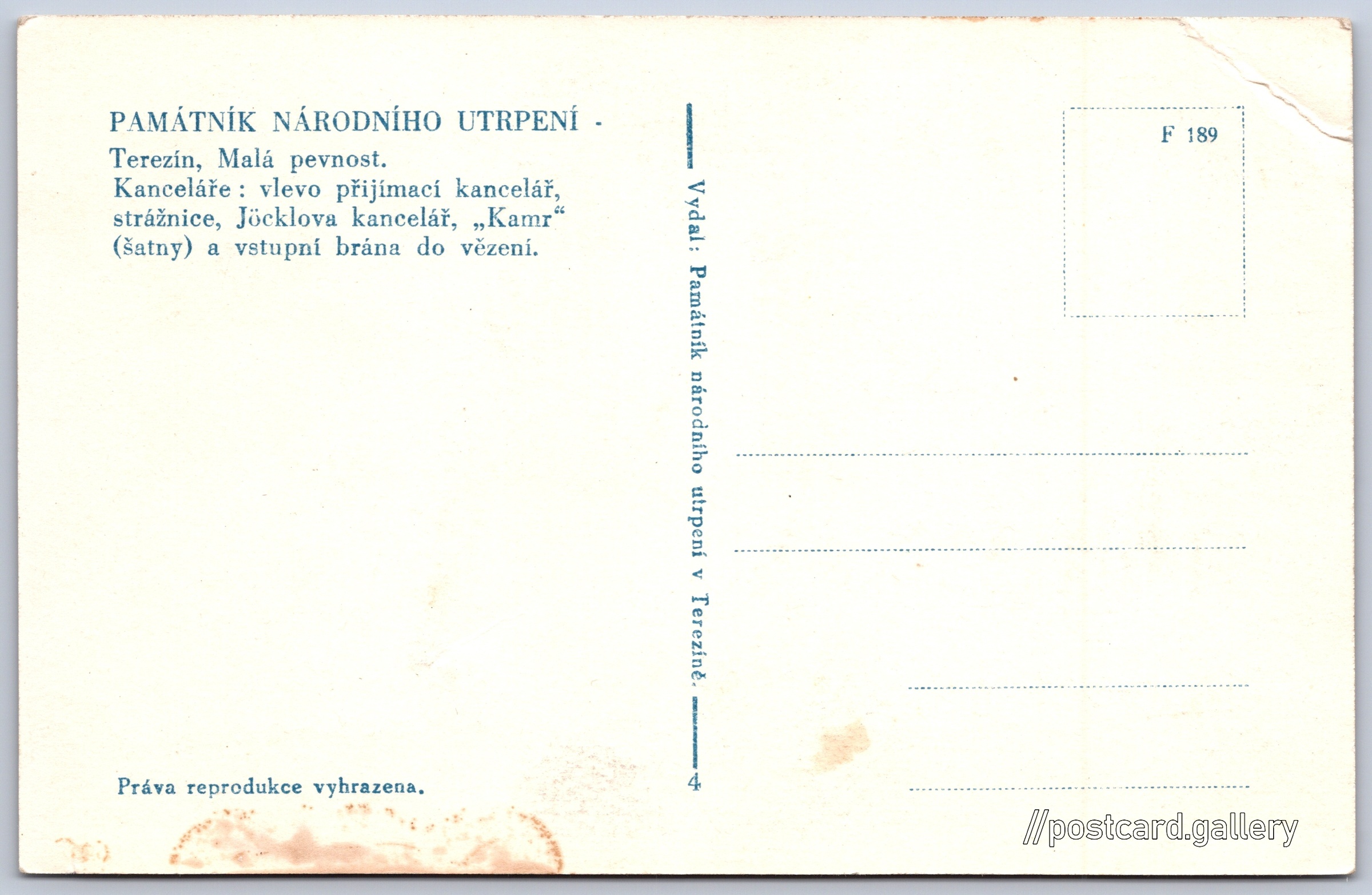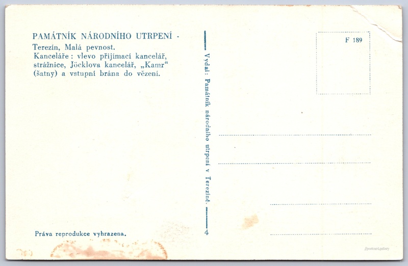 Memorial of National Suffering, Terezín Pokud chcete vidět pohlednice ve vyšším rozlišení nebo zobrazovat jejich zadní stranu, tak se prosím nejdříve přihlašte Log in Register PAMÁTNÍK NÁRODNÍHO UTRPENÍ -Terezín, Malá pevnost.Kanceláře: vlevo přijímací kancelář, strážnice, Jöcklova kancelář, "Kamr“ (šatny) a vstupní brána do vězení. Language of printed text on postcard: Czech Terezín, Litoměřice show on map Publisher: Památník národního utrpení v Terezíně (Czechoslovakia) Estimated issue date of postcard: 1945 - 1950 Help us specify date of postcard publishing Postcard size (w x h) and shape: 139 x 90 mm (5.47" x 3.54"), rectangle Unused postcard Postcard codes: F 189 DiscussionAdd post Add new folder ... Manage folders ...
