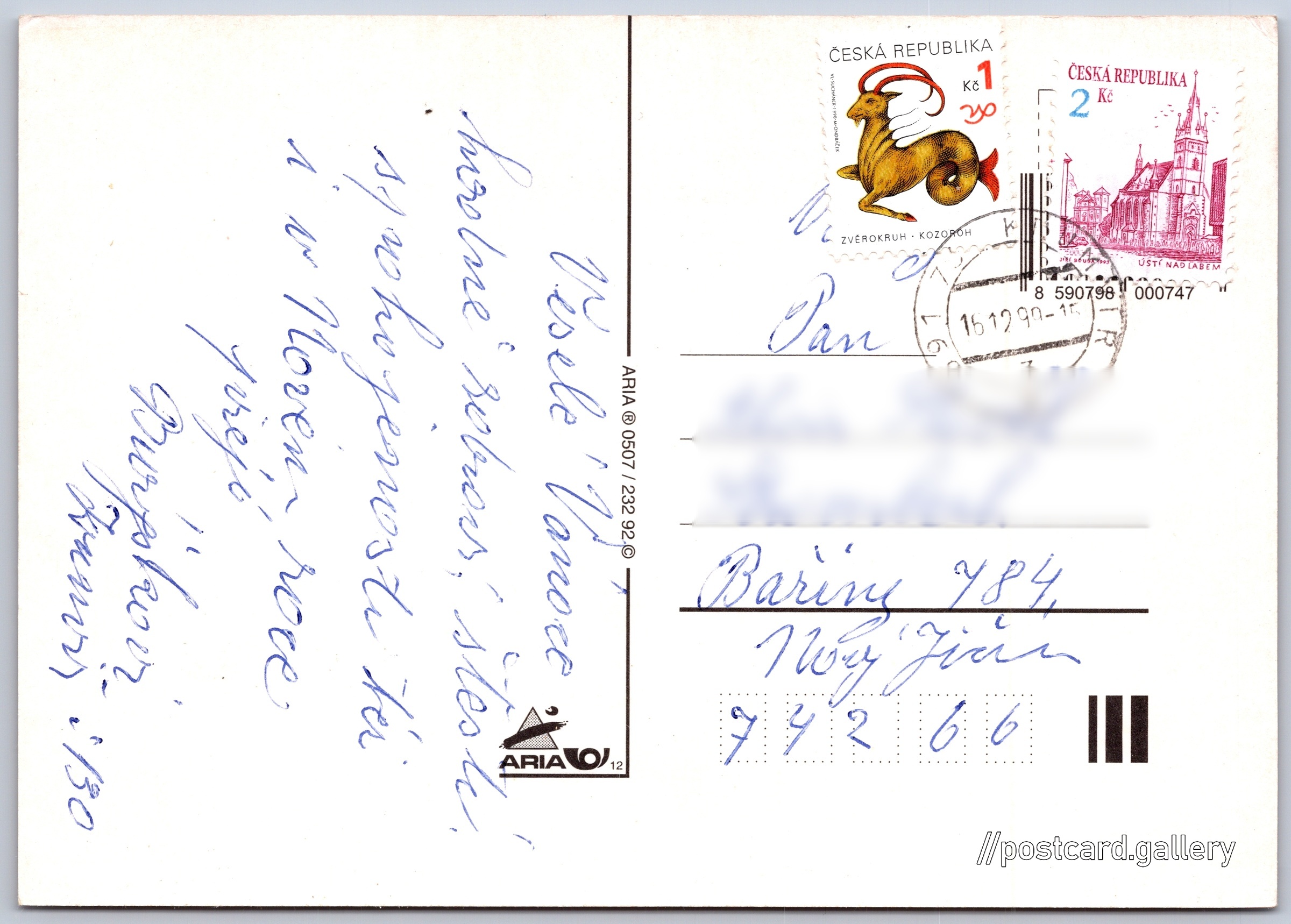 Merry Christmas and Happy New Year Pokud chcete vidět pohlednice ve vyšším rozlišení nebo zobrazovat jejich zadní stranu, tak se prosím nejdříve přihlašte Log in Register Radostné vánoce a šťastný nový rok Language of printed text on postcard: Czech Publisher: ARIA-Cards (Czechia) Estimated issue date of postcard: 1996 - 1999 Help us specify date of postcard publishing Postcard size (w x h) and shape: 147 x 105 mm (5.79" x 4.13"), rectangle Used postcard:Stamp date: 16.12.1999 Prices: Paid stamps: 3,00 Kč (CZK) Postcard codes: 8590798000747 CP 12 DiscussionAdd post Add new folder ... Manage folders ...