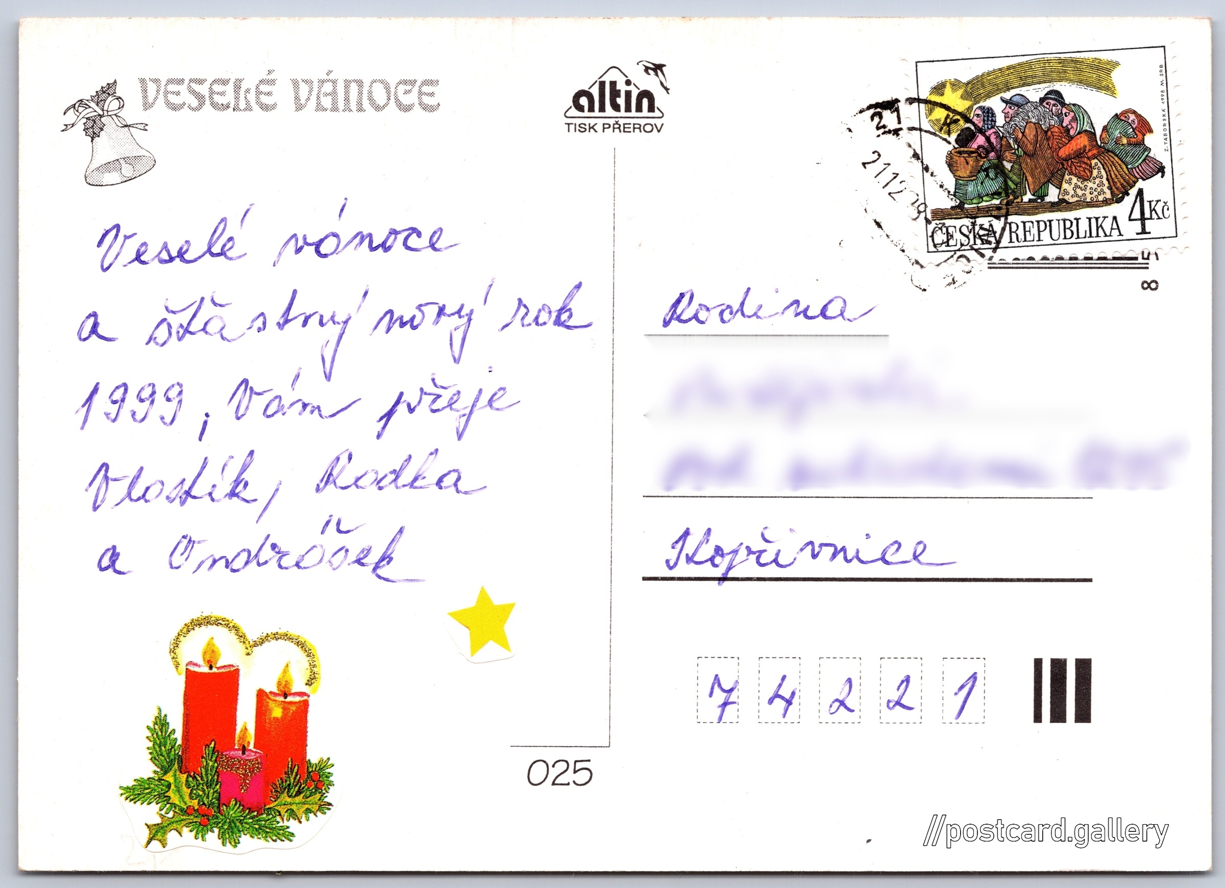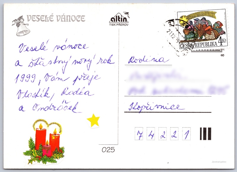 Merry Christmas Pokud chcete vidět pohlednice ve vyšším rozlišení nebo zobrazovat jejich zadní stranu, tak se prosím nejdříve přihlašte Log in Register Radostné Vánoce VESELÉ VÁNOCE Language of printed text on postcard: Czech Publisher: altin, Tisk Přerov (Czechia) Estimated issue date of postcard: 1995 - 1998 Help us specify date of postcard publishing Postcard size (w x h) and shape: 145 x 103 mm (5.71" x 4.06"), rectangle Used postcard:Stamp date: 21.12.1998 Prices: Paid stamps: 4,00 Kč (CZK) Postcard codes: 025 DiscussionAdd post Add new folder ... Manage folders ...