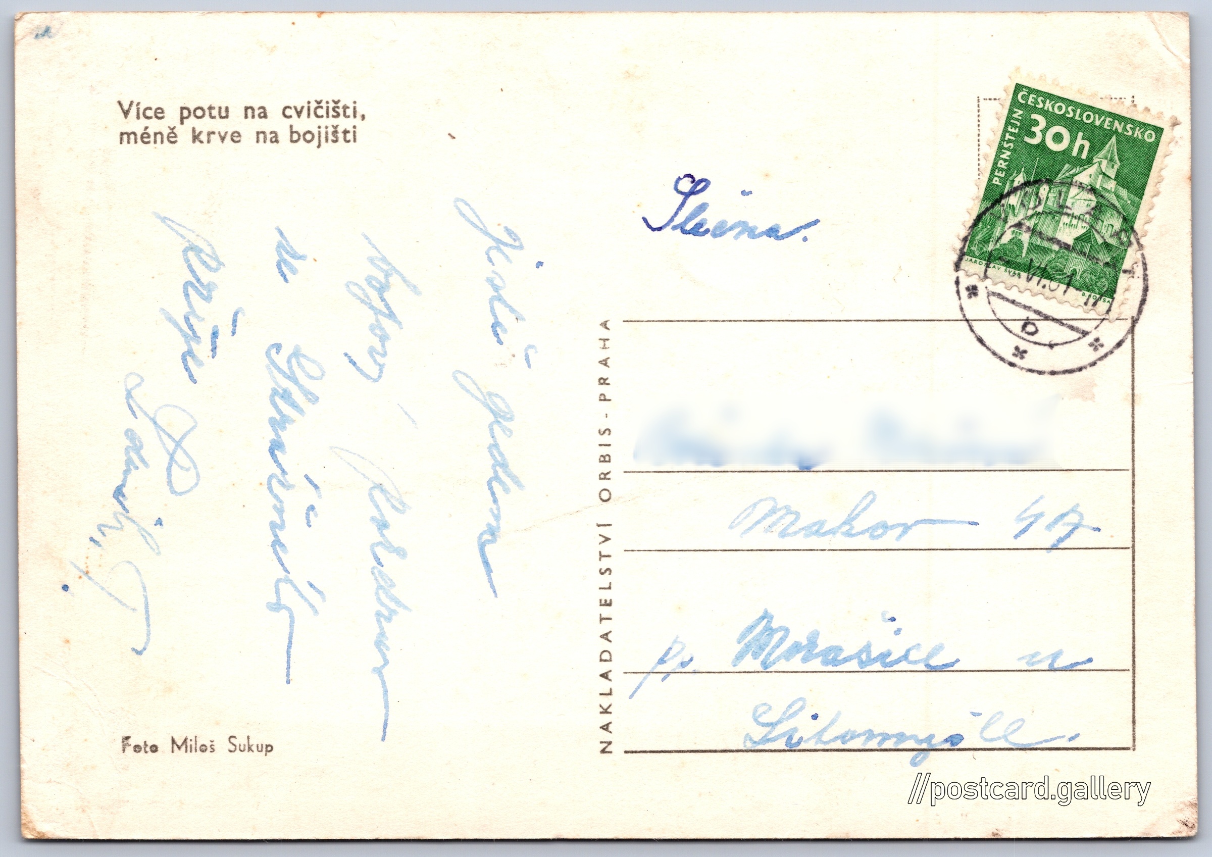 More sweat on the training ground, less blood on the battlefield 3/3 Pokud chcete vidět pohlednice ve vyšším rozlišení nebo zobrazovat jejich zadní stranu, tak se prosím nejdříve přihlašte Log in Register Více potu na cvičišti, méně krve na bojišti Language of printed text on postcard: Czech Publisher: Nakladatelství Orbis (Czechoslovakia) Estimated issue date of postcard: 1958 - 1961 Help us specify date of postcard publishing Postcard size (w x h) and shape: 147 x 103 mm (5.79" x 4.06"), rectangle Persons connected with this postcard: Miloš Sukup(Photo author) Used postcard:Stamp date: 6.6.1961 Prices: Paid stamps: 0,30 Kčs (CSK) DiscussionAdd post Add new folder ... Manage folders ...