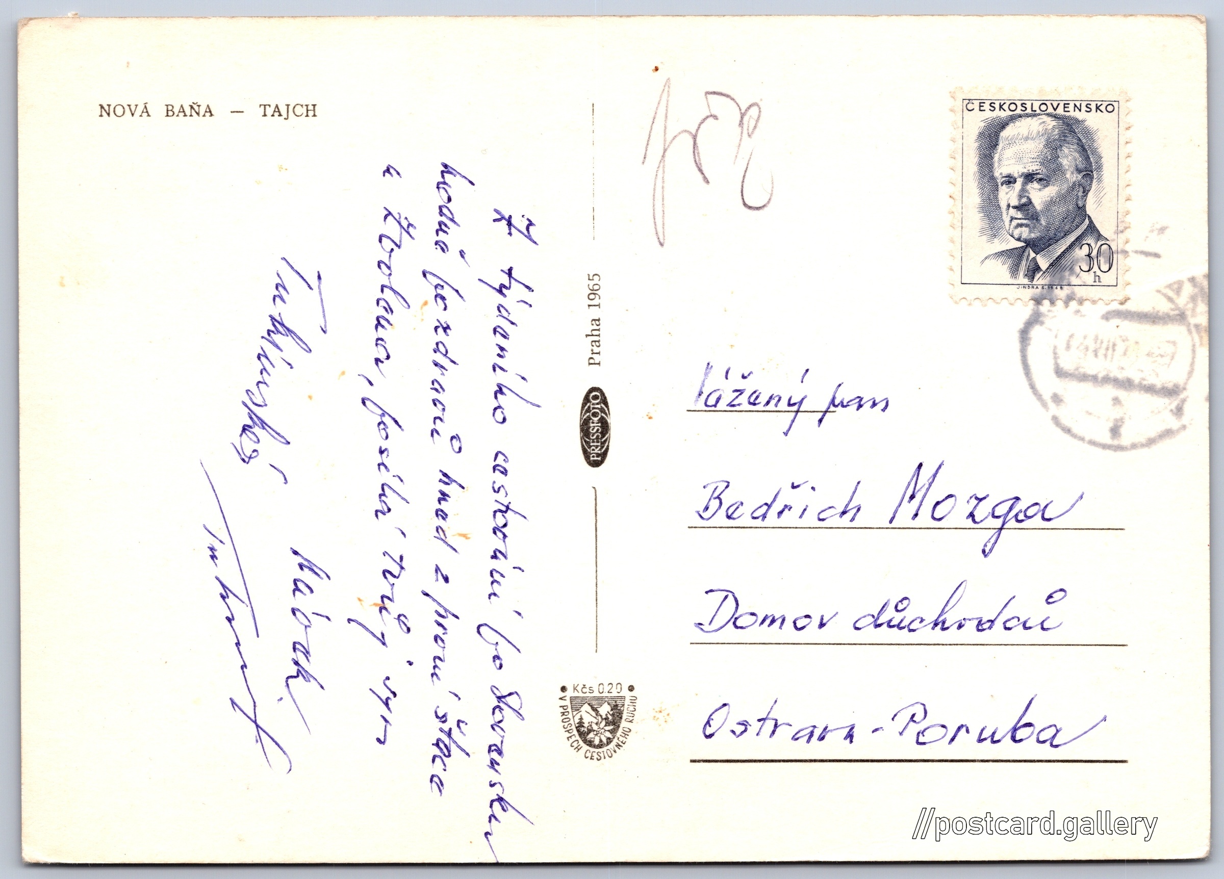 Nová Baňa, Tajch Pokud chcete vidět pohlednice ve vyšším rozlišení nebo zobrazovat jejich zadní stranu, tak se prosím nejdříve přihlašte Log in Register NOVÁ BAŇA - TAJCH Language of printed text on postcard: Slovak Tajch, Ulice, Nová Baňa, Slovensko show on map Publisher: PressFoto Praha (Czechoslovakia) Issue year of postcard: 1965 Postcard size (w x h) and shape: 147 x 104 mm (5.79" x 4.09"), rectangle Used postcard Prices: Fee to support turism: 0,20 Kčs (CSK)Paid stamps: 0,30 Kčs (CSK) DiscussionAdd post Add new folder ... Manage folders ...