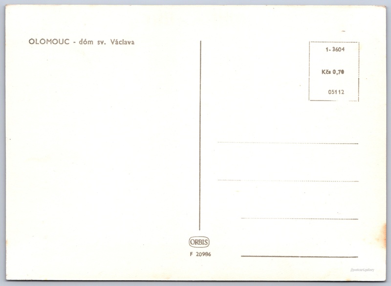 Olomouc, St. Wenceslas Cathedral 2/27 Pokud chcete vidět pohlednice ve vyšším rozlišení nebo zobrazovat jejich zadní stranu, tak se prosím nejdříve přihlašte Log in Register OLOMOUC - dóm sv. Václava Language of printed text on postcard: Slovak Katedrála sv. Václava, Kostel, Olomouc, Česko show on map 27 other postcards can be found in the immediate vicinity of the place shown on the postcard Show near postcards Publisher: Nakladatelství Orbis (Czechoslovakia) Issue date of postcard is not known Help us estimate date of postcard publishing Postcard size (w x h) and shape: 146 x 105 mm (5.75" x 4.13"), rectangle Unused postcard Prices: Postcard price: 0,70 Kčs (CSK) Postcard codes: F 20986 1-3604 05112 DiscussionAdd post Add new folder ... Manage folders ...