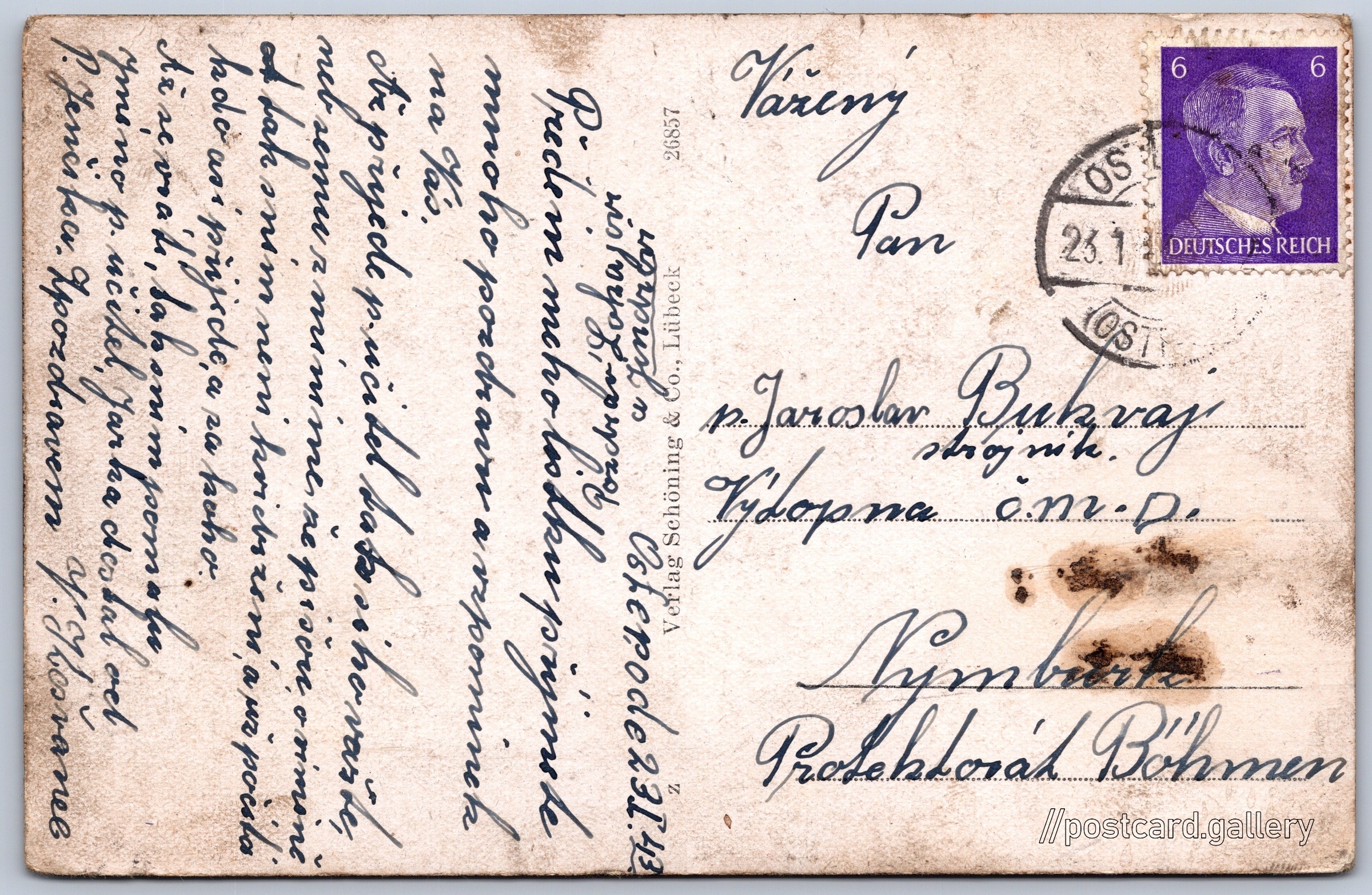 Osterode, East Prussia Pokud chcete vidět pohlednice ve vyšším rozlišení nebo zobrazovat jejich zadní stranu, tak se prosím nejdříve přihlašte Log in Register Osterode, Ostpr.- Blick über den Drewenzsee Language of printed text on postcard: Czech Ostróda show on map Publisher: Schöning & Co + Gebrüder Schmidt (Germany) Estimated issue date of postcard: 1942 - 1943 Help us specify date of postcard publishing Postcard size (w x h) and shape: 140 x 90 mm (5.51" x 3.54"), rectangle Used postcard:Stamp date: 23.1.1943Write date: 23.1.1943 Prices: Paid stamps: 0,06 ℛℳ (RM) Postcard codes: 26857 DiscussionAdd post Add new folder ... Manage folders ...