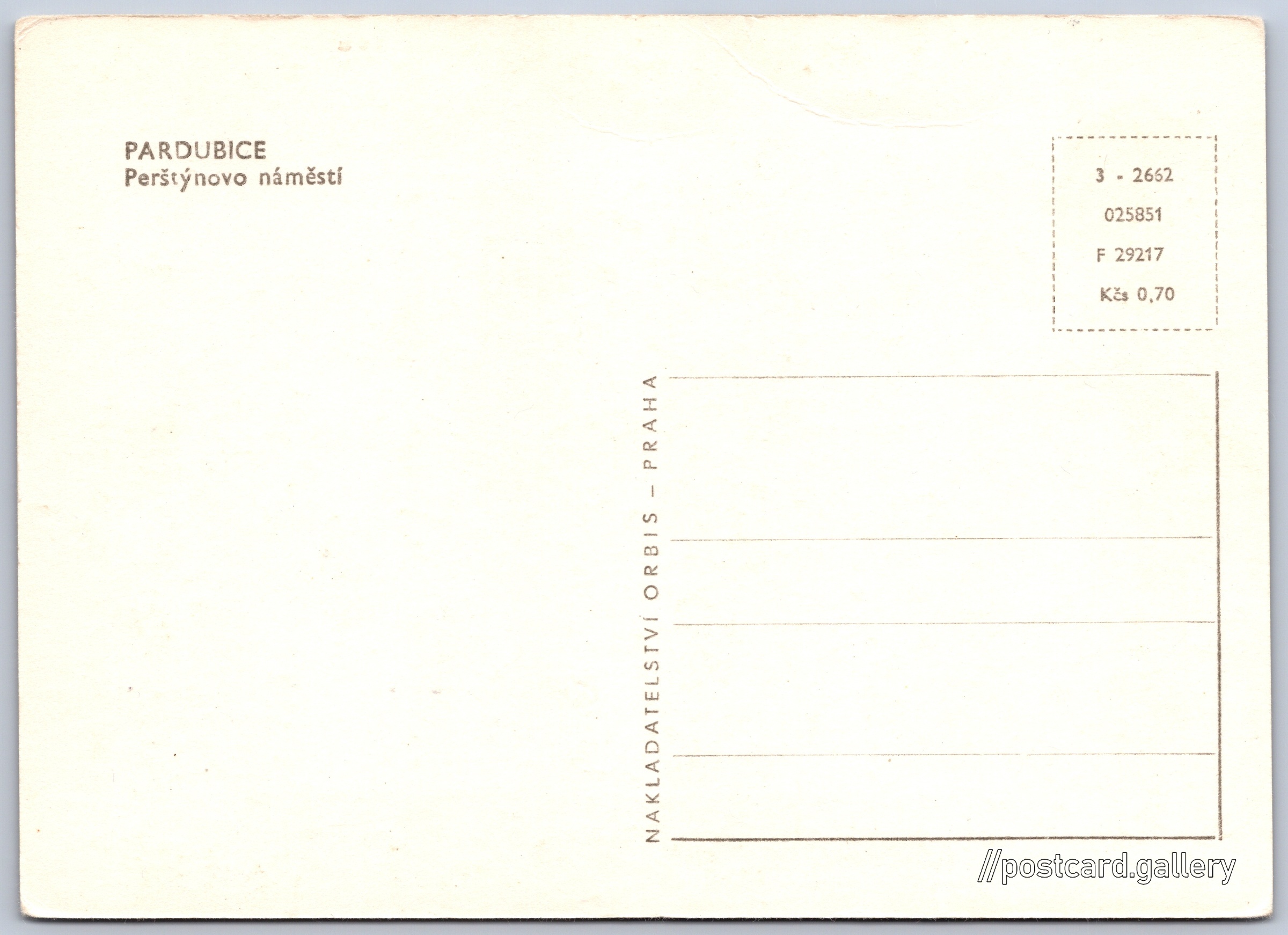 Pardubice, Perštýnovo náměstí Pokud chcete vidět pohlednice ve vyšším rozlišení nebo zobrazovat jejich zadní stranu, tak se prosím nejdříve přihlašte Log in Register PARDUBICEPerštýnovo náměstí Language of printed text on postcard: Czech Pernštýnské náměstí, Pardubice, Pardubice show on map 4 other postcards can be found in the immediate vicinity of the place shown on the postcard Show near postcards Publisher: Nakladatelství Orbis (Czechoslovakia) Issue date of postcard is not known Help us estimate date of postcard publishing Postcard size (w x h) and shape: 145 x 105 mm (5.71" x 4.13"), rectangle Unused postcard Prices: Postcard price: 0,70 Kčs (CSK) Postcard codes: 3-2662 025851 F 29217 DiscussionAdd post Add new folder ... Manage folders ...