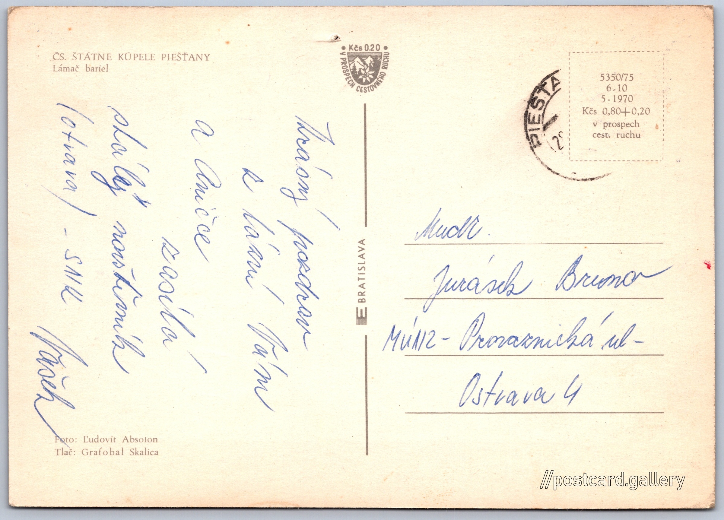 Piešt'any, statue of a crutch breaker Pokud chcete vidět pohlednice ve vyšším rozlišení nebo zobrazovat jejich zadní stranu, tak se prosím nejdříve přihlašte Log in Register ČS. ŠTÁTNE KÚPELE PIEŠŤANYLámač bariel Language of printed text on postcard: Slovak The Crutchbreaker, Socha, Piešťany, Slovensko show on map 22 other postcards can be found in the immediate vicinity of the place shown on the postcard Show near postcards Publisher: E Bratislava (Czechoslovakia) Issue date of postcard is not known Help us estimate date of postcard publishing Postcard size (w x h) and shape: 148 x 105 mm (5.83" x 4.13"), rectangle Persons connected with this postcard: Ľudovít Absolon(Photo author) Used postcard Prices: Postcard price: 0,80 Kčs (CSK) (+0,20 Kčs fee to support tourism) Postcard codes: 5350/75 6-10 5-1970 DiscussionAdd post Add new folder ... Manage folders ...