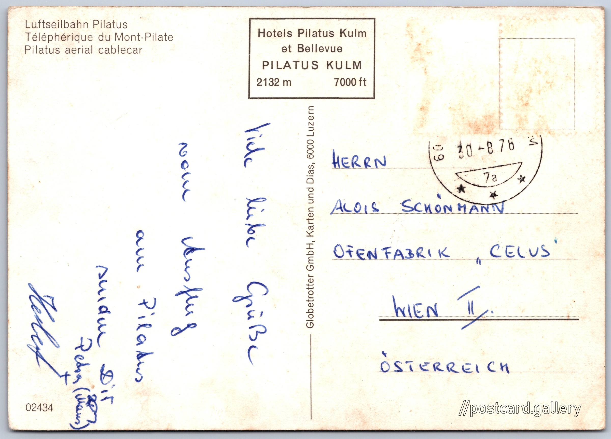 Pilatus, aerial cablecar Pokud chcete vidět pohlednice ve vyšším rozlišení nebo zobrazovat jejich zadní stranu, tak se prosím nejdříve přihlašte Log in Register - Luftseilbahn Pilatus- Téléphérique du Mont-Pilate- Pilatus aerial cablecarHotels Pilatus Kulm et BellevuePILATUS KULM2132 m7000 ft Language of printed text on postcard: German Bergstation Pilatus Kulm (Luftseilbahn- Dragon Ride), Stanice lanovky, vleku, Alpnach, kanton Obwalden, Švýcarsko show on map 1 other postcard can be found in the immediate vicinity of the place shown on the postcard Show near postcards Publisher: Globetrotter GmbH (Switzerland) Estimated issue date of postcard: 1973 - 1976 Help us specify date of postcard publishing Postcard size (w x h) and shape: 148 x 105 mm (5.83" x 4.13"), rectangle Used postcard:Stamp date: 30.8.1976 Postcard codes: 02434 DiscussionAdd post Add new folder ... Manage folders ...