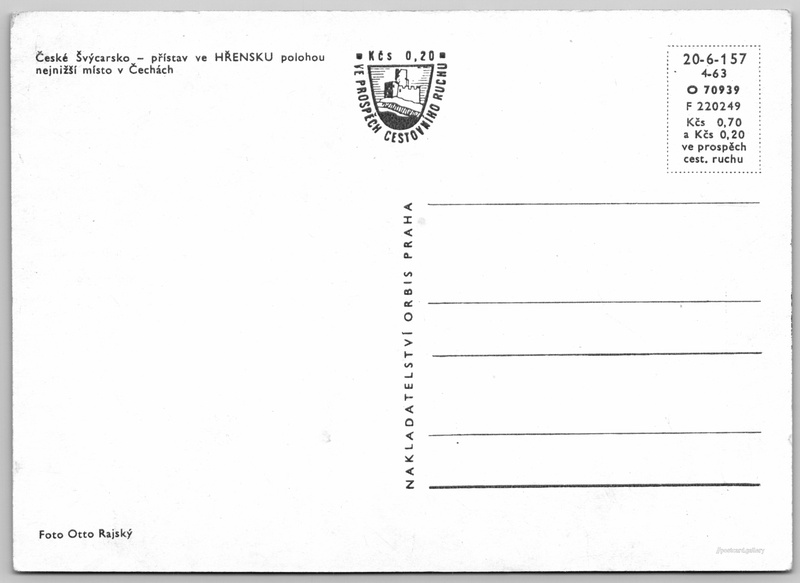 Port in Hřensko 3/31 Pokud chcete vidět pohlednice ve vyšším rozlišení nebo zobrazovat jejich zadní stranu, tak se prosím nejdříve přihlašte Log in Register České Švýcarsko - přístav ve HŘENSKU polohou nejnižší místo v Čechách Language of printed text on postcard: Czech Přístaviště Hřensko, Přístav, Hřensko, Česko show on map 31 other postcards can be found in the immediate vicinity of the place shown on the postcard Show near postcards Publisher: Nakladatelství Orbis (Czechoslovakia) Issue year of postcard: April, 1963 Postcard size (w x h) and shape: 146 x 105 mm (5.75" x 4.13"), rectangle Persons connected with this postcard: Otto Rajský(Photo author) Unused postcard Prices: Postcard price: 0,70 Kčs (CSK) (+0,20 Kčs fee to support tourism) Postcard codes: 20-6-157 4-63 O 70939 F 220249 DiscussionAdd post Add new folder ... Manage folders ...