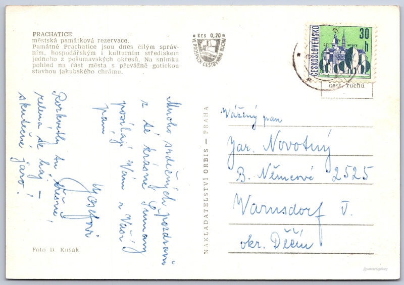 Prachatice Pokud chcete vidět pohlednice ve vyšším rozlišení nebo zobrazovat jejich zadní stranu, tak se prosím nejdříve přihlašte Log in Register PRACHATICEměstská památková rezervace.Památné Prachatice jsou dnes čilým správním, hospodářským i kulturním střediskem jednoho z pošumavských okresů. Na snímkupohled na část města s převážně gotickou stavbou jakubského chrámu. Language of printed text on postcard: Czech Prachatice, Město, Česko show on map Publisher: Nakladatelství Orbis (Czechoslovakia) Estimated issue date of postcard: 1960 - 1963 Help us specify date of postcard publishing Postcard size (w x h) and shape: 146 x 101 mm (5.75" x 3.98"), rectangle Persons connected with this postcard: Dalibor Kusák(Photo author) Used postcard Prices: Fee to support turism: 0,20 Kčs (CSK)Paid stamps: 0,30 Kčs (CSK) DiscussionAdd post Add new folder ... Manage folders ...