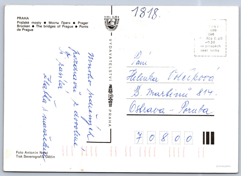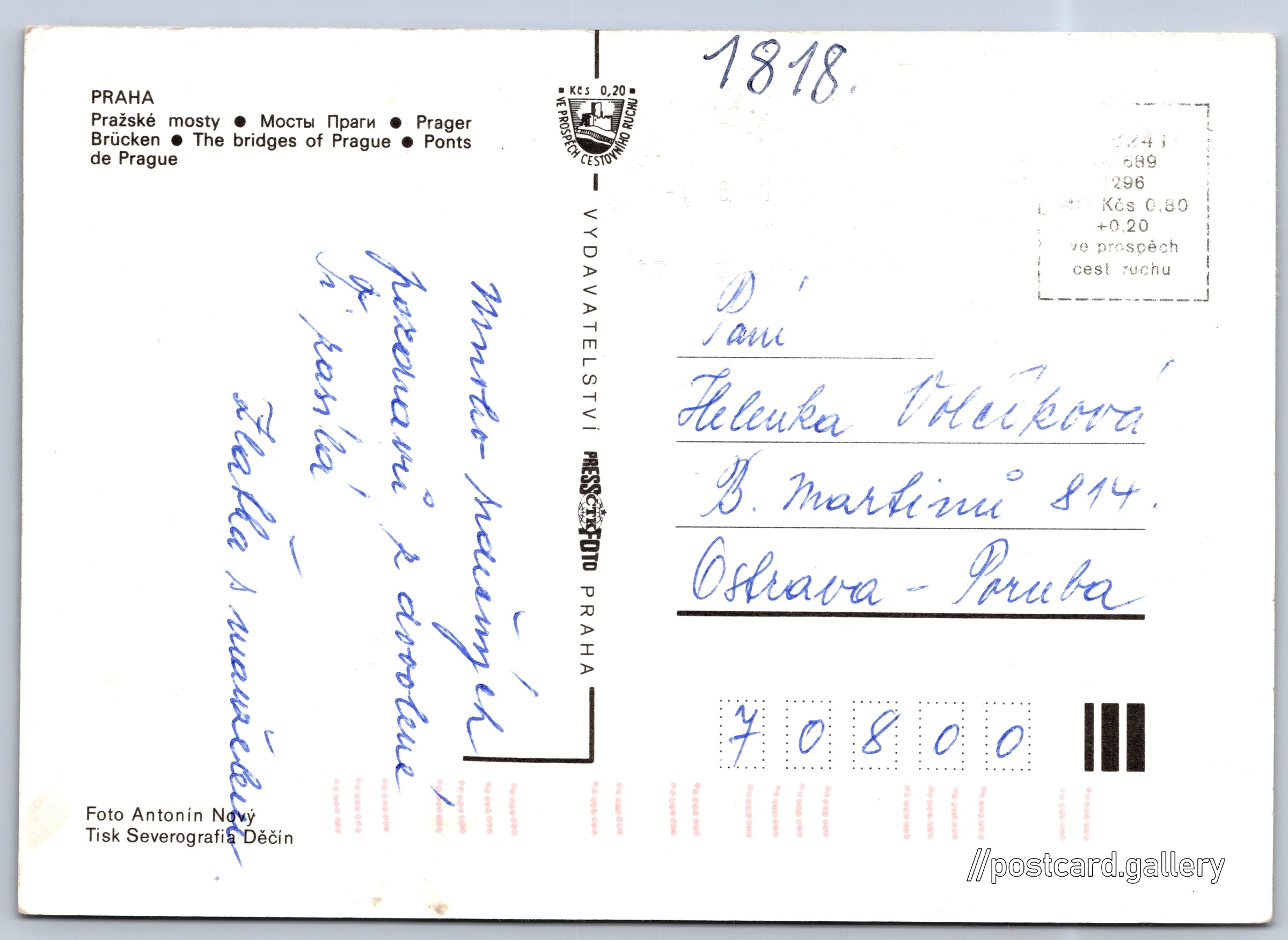 Prague bridges Pokud chcete vidět pohlednice ve vyšším rozlišení nebo zobrazovat jejich zadní stranu, tak se prosím nejdříve přihlašte Log in Register PRAHA- Pražské mosty- Мосты Праги- Prager Brücken- The bridges of Prague- Ponts de Prague Language of printed text on postcard: Czech, Russian, German, English, French, French Mánesův most, Praha, Hlavní město Praha show on map 159 other postcards can be found in the immediate vicinity of the place shown on the postcard Show near postcards Publisher: PressFoto Praha (Czechoslovakia) Issue year of postcard: 1986 Postcard size (w x h) and shape: 148 x 105 mm (5.83" x 4.13"), rectangle Persons connected with this postcard: Antonín E. Nový(Photo author) Used postcard Prices: Postcard price: 0,80 Kčs (CSK) (+0,20 Kčs fee to support tourism) DiscussionAdd post Add new folder ... Manage folders ...