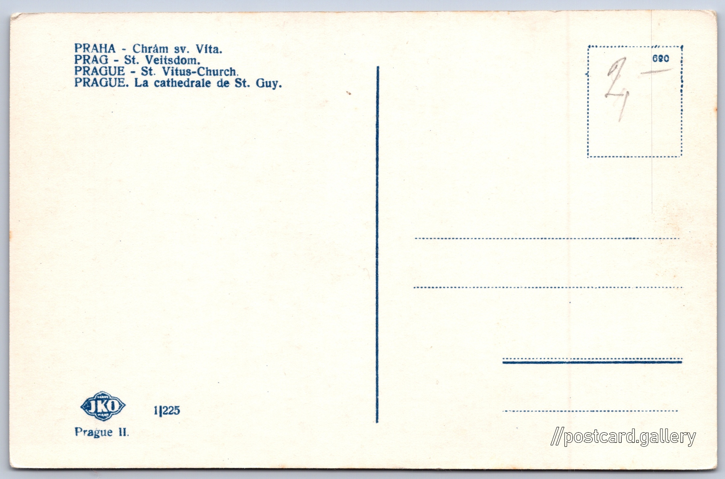 Prague, St. Vitus Cathedral Pokud chcete vidět pohlednice ve vyšším rozlišení nebo zobrazovat jejich zadní stranu, tak se prosím nejdříve přihlašte Log in Register Praha. Chrám sv. Víta PRAHA - Chrám sv. Víta.PRAG - St. Veitsdom.PRAGUE - St. Vitus-Church.PRAGUE. La cathedrale de St. Guy.Prague II. Language of printed text on postcard: Czech, German, English, French Katedrála sv. Víta, Václava a Vojtěcha, Kostel, Vikářská, Praha, Česko show on map Publisher: JKO (Czechoslovakia) Issue date of postcard is not known Help us estimate date of postcard publishing Postcard size (w x h) and shape: 141 x 92 mm (5.55" x 3.62"), rectangle Unused postcard Postcard codes: 1|225 690 DiscussionAdd post Add new folder ... Manage folders ...
