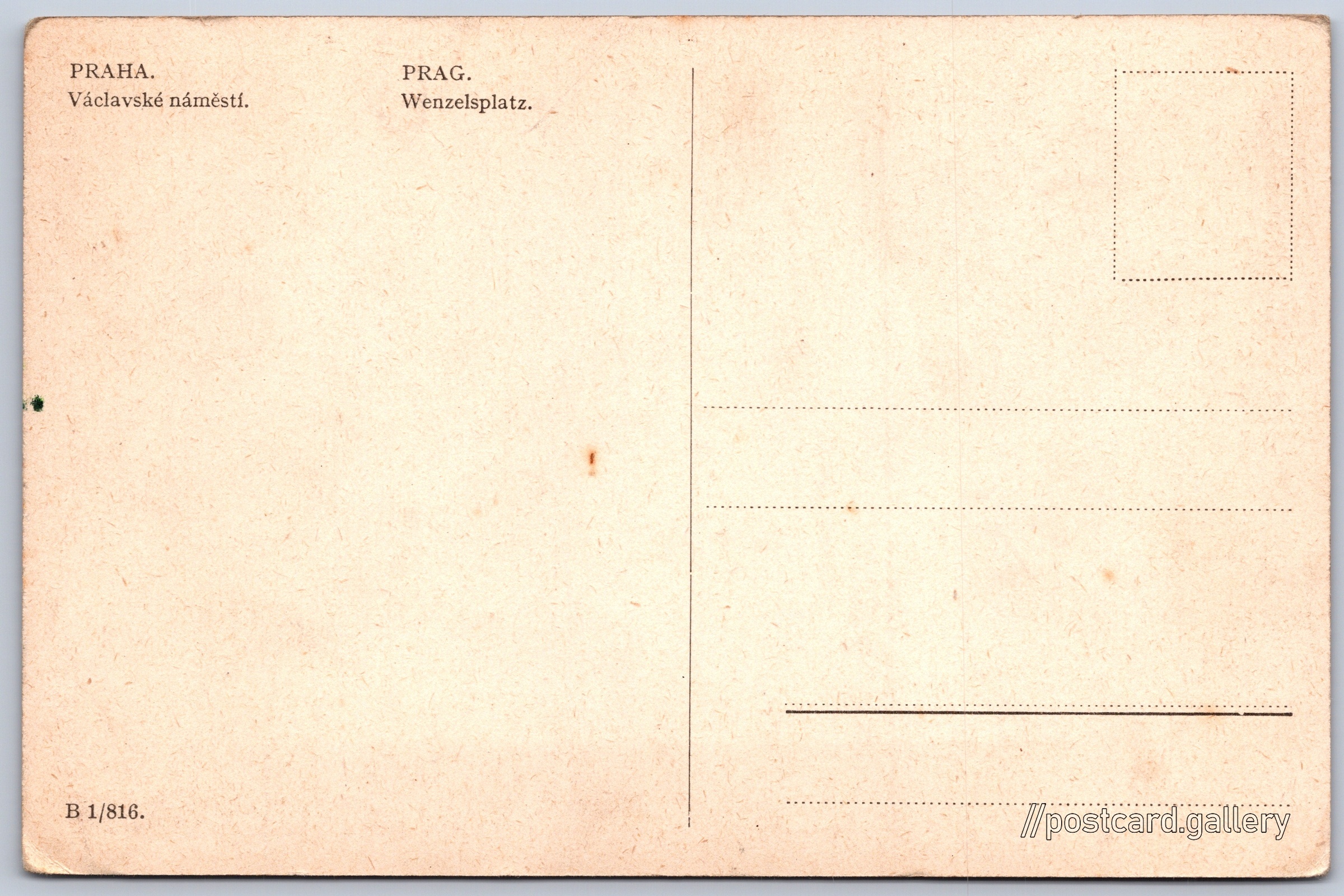 Prague, Wenceslas Square, view from the museum 4/159 Pokud chcete vidět pohlednice ve vyšším rozlišení nebo zobrazovat jejich zadní stranu, tak se prosím nejdříve přihlašte Log in Register Praha. Václavské náměstí. PRAHA. Václavské náměstí.PRAG. Wenzelsplatz. Language of printed text on postcard: German, Czech Václavské náměstí 1700/68, Praha, 110 00, Hlavní město Praha show on map 159 other postcards can be found in the immediate vicinity of the place shown on the postcard Show near postcards Issue date of postcard is not known Help us estimate date of postcard publishing Postcard size (w x h) and shape: 139 x 92 mm (5.47" x 3.62"), rectangle Unused postcard Postcard codes: B 1/816 DiscussionAdd post Add new folder ... Manage folders ...