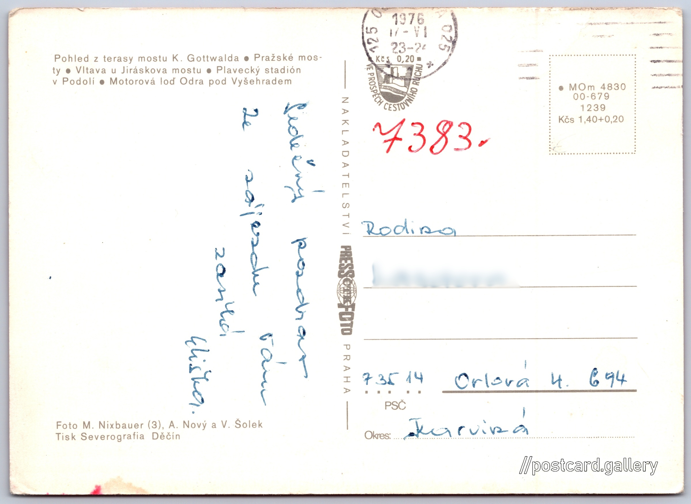 Prague Pokud chcete vidět pohlednice ve vyšším rozlišení nebo zobrazovat jejich zadní stranu, tak se prosím nejdříve přihlašte Log in Register Praha - Pohled z terasy mostu K. Gottwalda- Pražské mosty- Vltava u Jiráskova mostu- Plavecký stadión v Podolí- Motorová loď Odra pod Vyšehradem Language of printed text on postcard: Czech Praha 4, Praha, Hlavní město Praha show on map Publisher: PressFoto Praha (Czechoslovakia) Issue year of postcard: 1976 Postcard size (w x h) and shape: 149 x 107 mm (5.87" x 4.21"), rectangle Persons connected with this postcard: Vítězslav Šolek(Photo author) Miloš Nixbauer(Photo author) Antonín E. Nový(Photo author) Used postcard:Stamp date: 17.6.1976 Prices: Postcard price: 1,40 Kčs (CSK) (+0,20 Kčs fee to support tourism) Postcard codes: •MOm 4830 00-679 1239 DiscussionAdd post Add new folder ... Manage folders ...