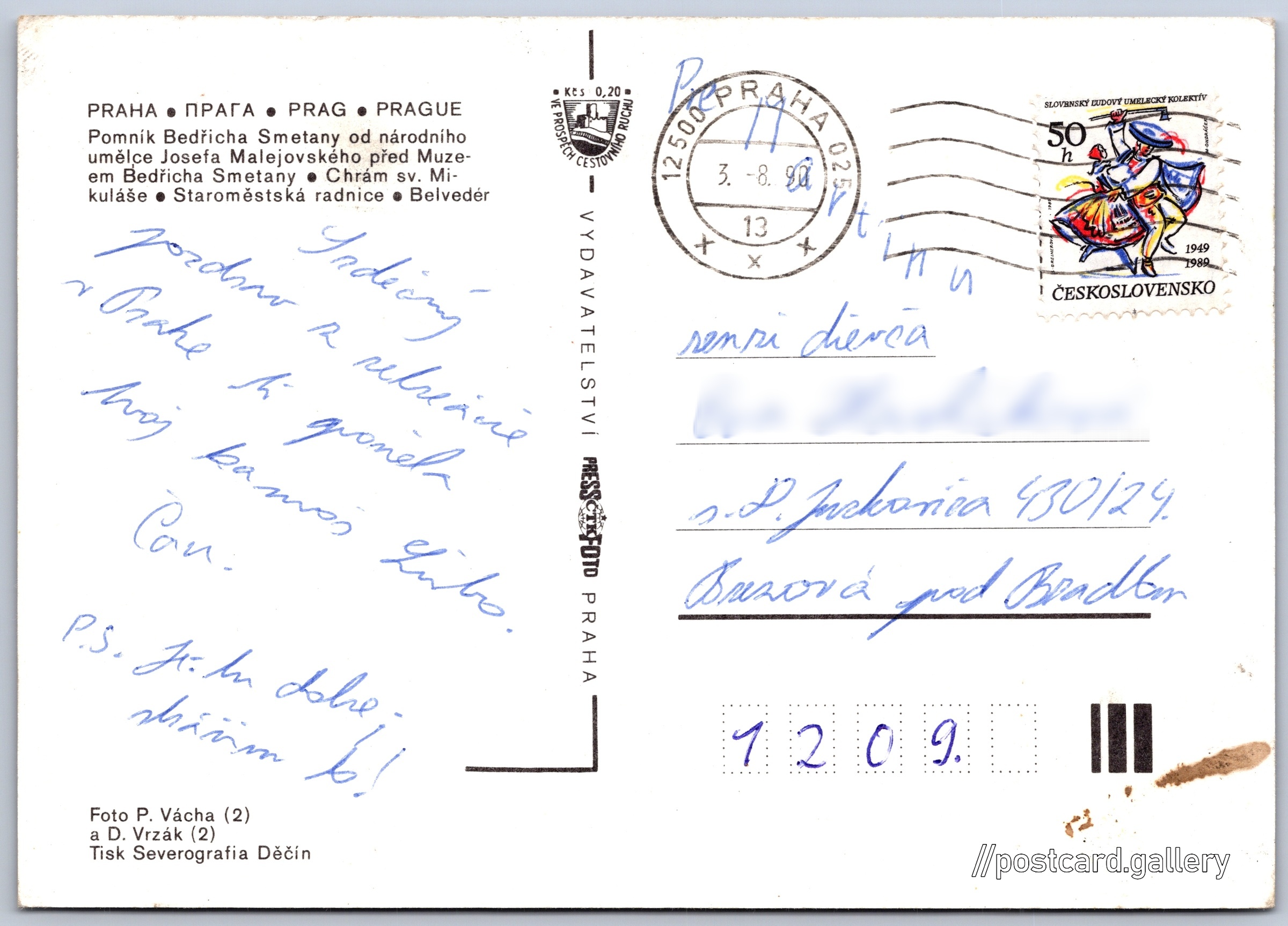 Praha Pokud chcete vidět pohlednice ve vyšším rozlišení nebo zobrazovat jejich zadní stranu, tak se prosím nejdříve přihlašte Log in Register Praha PRAHA - ПPATA - PRAG - PRAGUE- Pomník Bedřicha Smetany od národního umělce Josefa Malejovského před Muzeem Bedřicha Smetany- Chrám sv. Mikuláše- Staroměstská radnice- Belvedér Language of printed text on postcard: Czech Pomník Bedřicha Smetany, Pomník, památník, Novotného lávka, Praha, Česko show on map Publisher: PressFoto Praha (Czechoslovakia) Estimated issue date of postcard: 1987 - 1990 Help us specify date of postcard publishing Postcard size (w x h) and shape: 147 x 104 mm (5.79" x 4.09"), rectangle Persons connected with this postcard: Daniel Vrzák(Photo author) Bedřich Smetana(Content of postcard) Pavel Vácha(Photo author) Josef Malejovský(Content of postcard) Used postcard:Stamp date: 3.8.1990 Prices: Fee to support turism: 0,20 Kčs (CSK)Paid stamps: 0,30 Kčs (CSK) DiscussionAdd post Add new folder ... Manage folders ...
